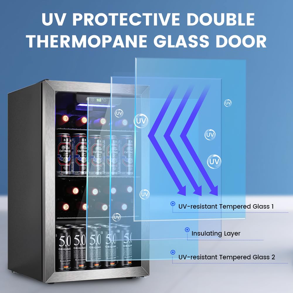 - Excellent Cooling: Our beverage refrigerator with glass door is equipped with a high-performance compressor that provides constant and even cooling. The glass door ensures airtight sealing to keep cold air inside and maintain your drinks at the ideal temperature at all times.