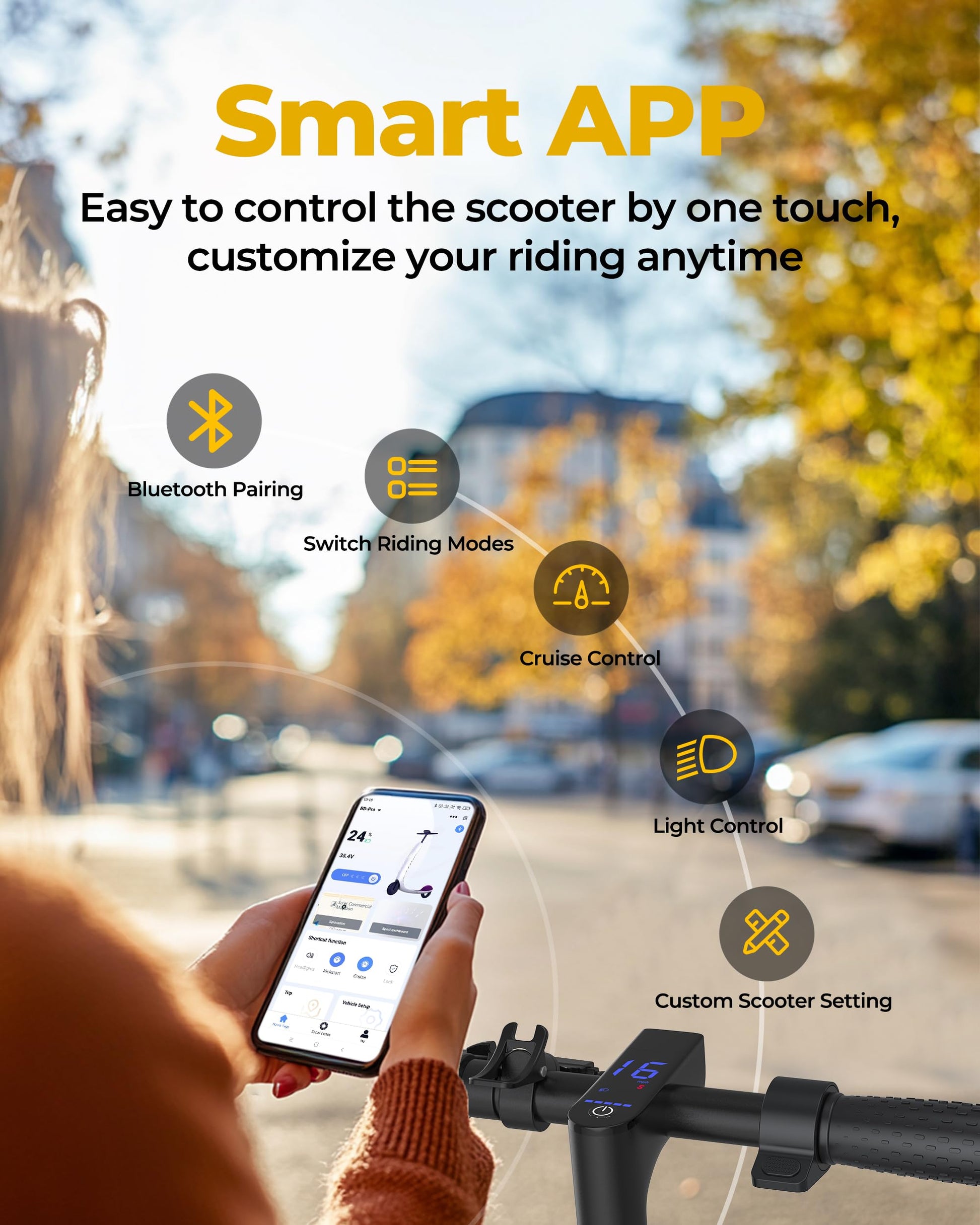 - ⭐Smart App Control: the electric scooter is equipped with an intelligent control system. It can realize locking, riding mode, lighting system, speed level, cruise control, start mode and scooter status display, etc. One-stop solution, comprehensive control, bringing more convenience to your riding