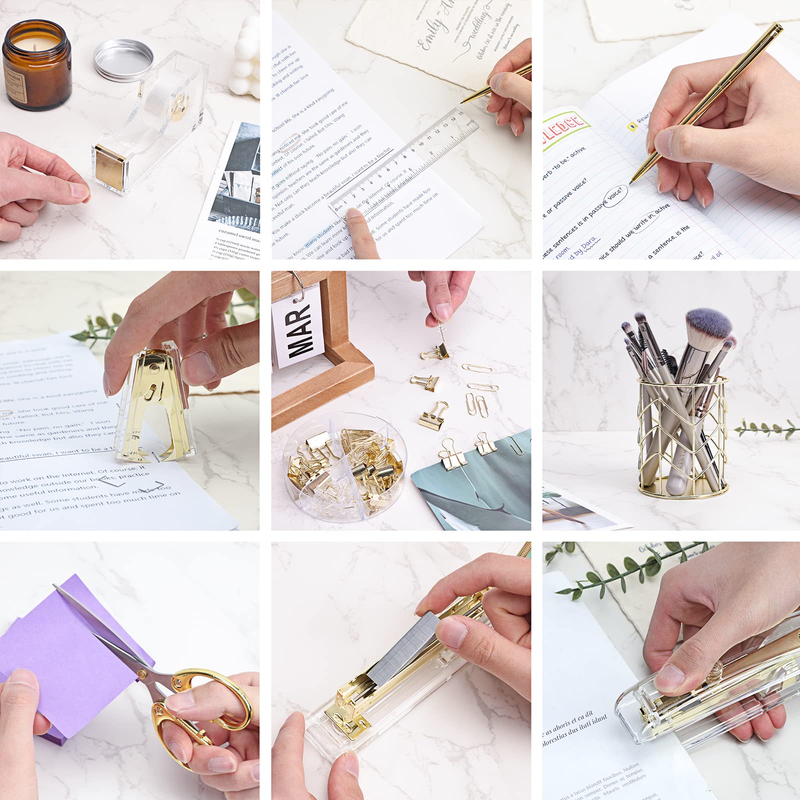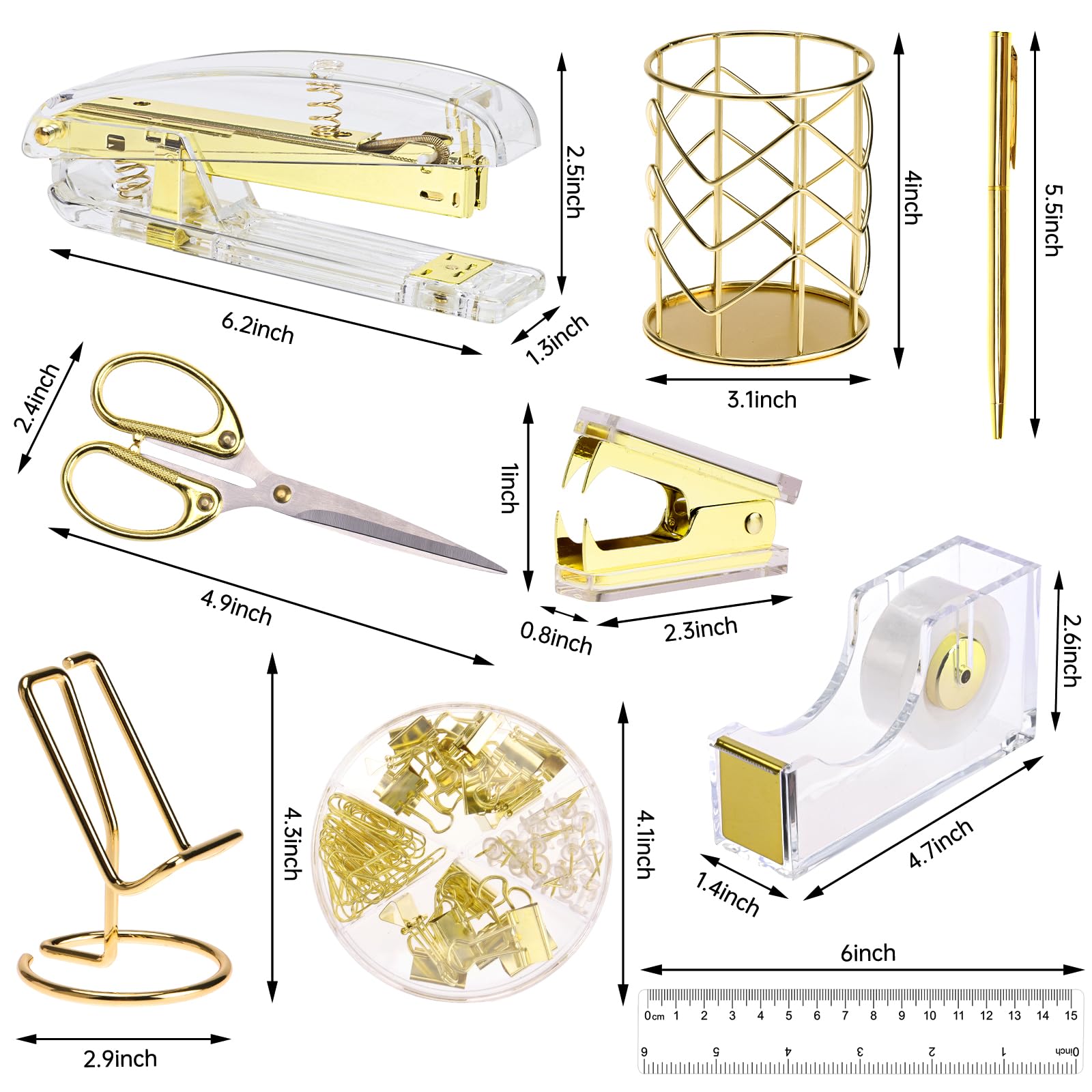- Packing Listing: 1x stapler, 1x staple remover, 1 x tape holder, 1x ruler, 1 x scissors, 1 x box of binder clips, 1000 x staples, 1 x phone holder, 1 x pen holder, 2 x pen, 1 x transparent glue ; This gold office set is rich in content and perfect for your desk, improving your productivity and making your office convenient and efficient.