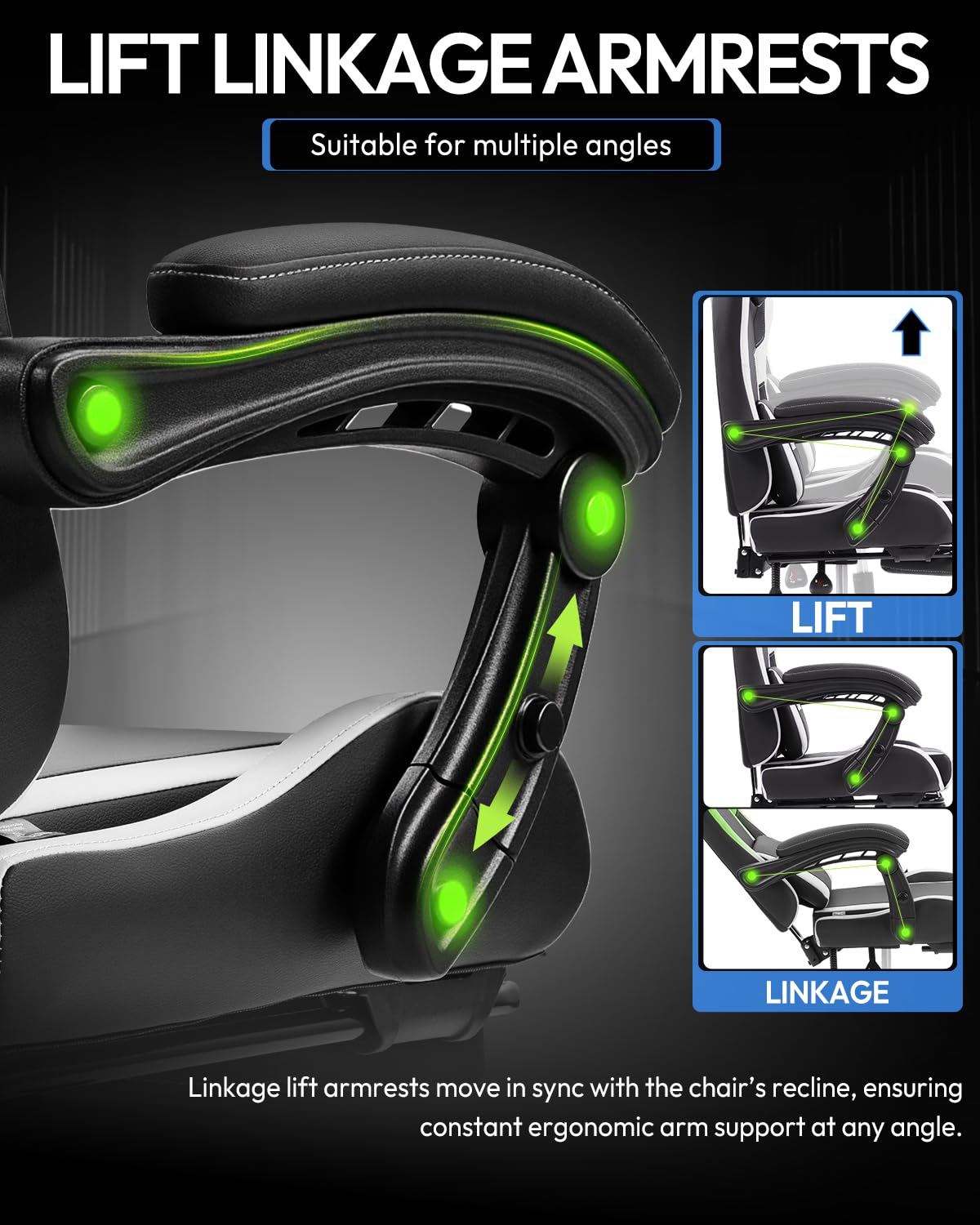 - Massage Lumbar Support – Stay Comfortable in Long Gaming or Work Sessions: Lower back pain is the #1 complaint from gamers and office workers. Our Ergonomic Gaming Chair with Massage Lumbar Pillow delivers soothing support that keeps your spine aligned during long gaming sessions, streaming, or working from home.