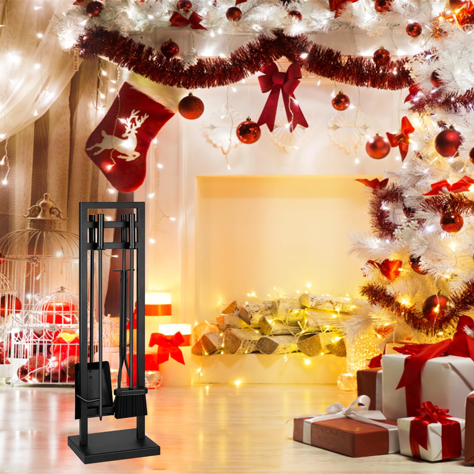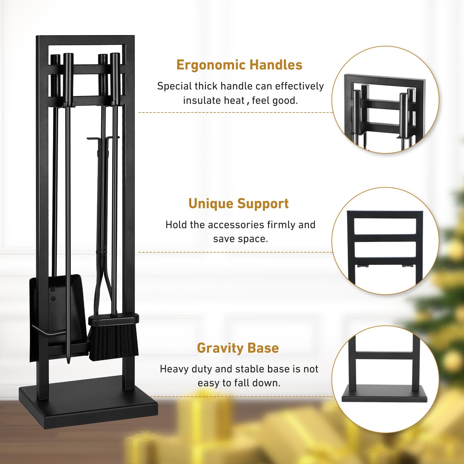 FEED GARDEN Fireplace Tools Set 5 Pieces, 30 Inch Modern Wrought Iron Outdoor Fireplace Accessories Set Long Holder Indoor with Poker, Tongs, Shovel, Brush, Base Black