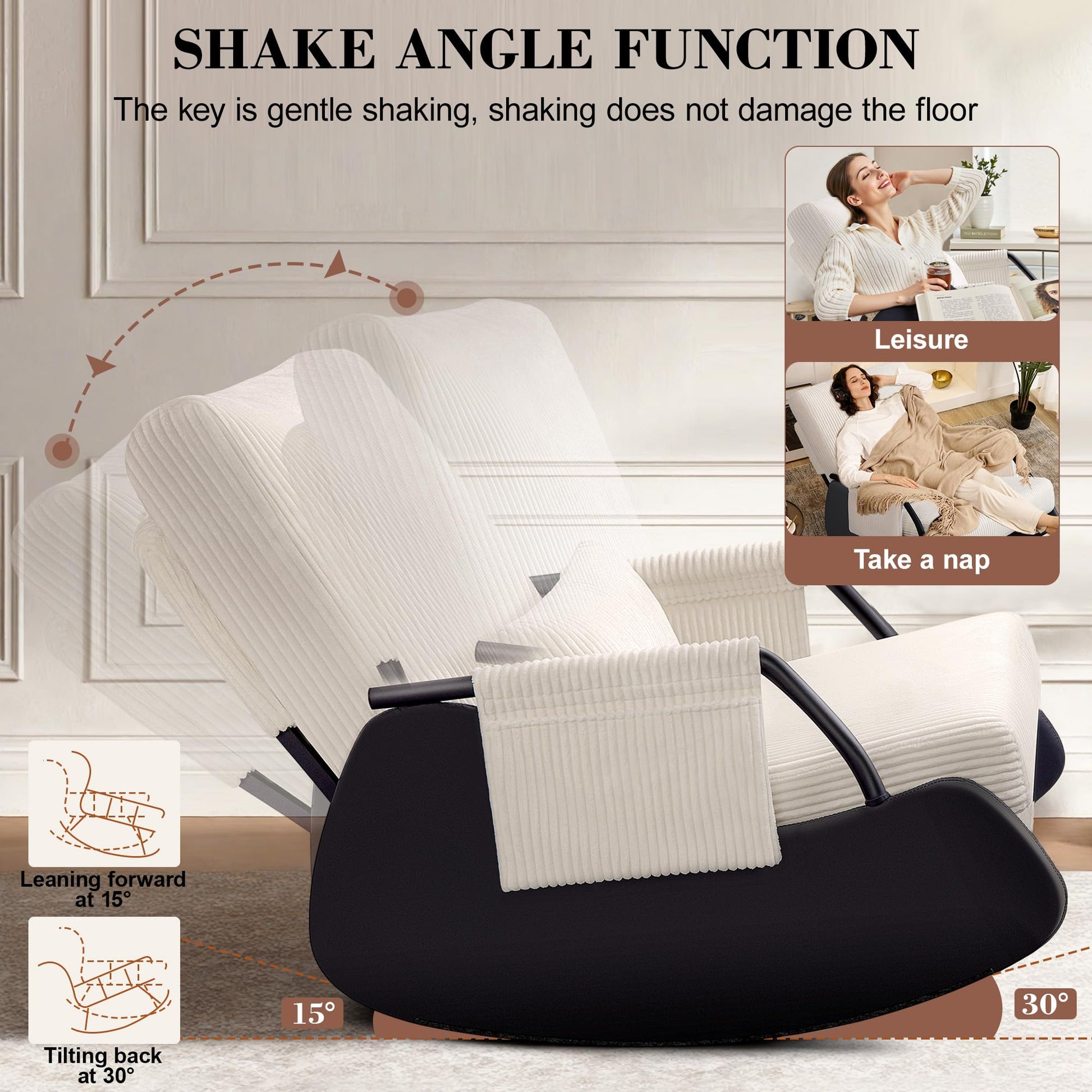 - ๐๐ฆ๐จ๐จ๐ญ๐ก ๐๐จ๐๐ค๐ข๐ง๐ ๐๐จ๐ซ ๐๐๐ฅ๐๐ฑ๐๐ญ๐ข๐จ๐ง: Experience smooth gliding with a 15ยฐ forward and 30ยฐ backward rocking arc, scientifically balanced using sled mechanics. The R20 rounded rocker base ensures stability, perfect for soothing a baby or relaxing after a long day. Safety-tested for peace of mind, its space-saving design fits living rooms, nurseries, bedrooms, reading nooks, porches, or balconiesโbringing comfort anywhere