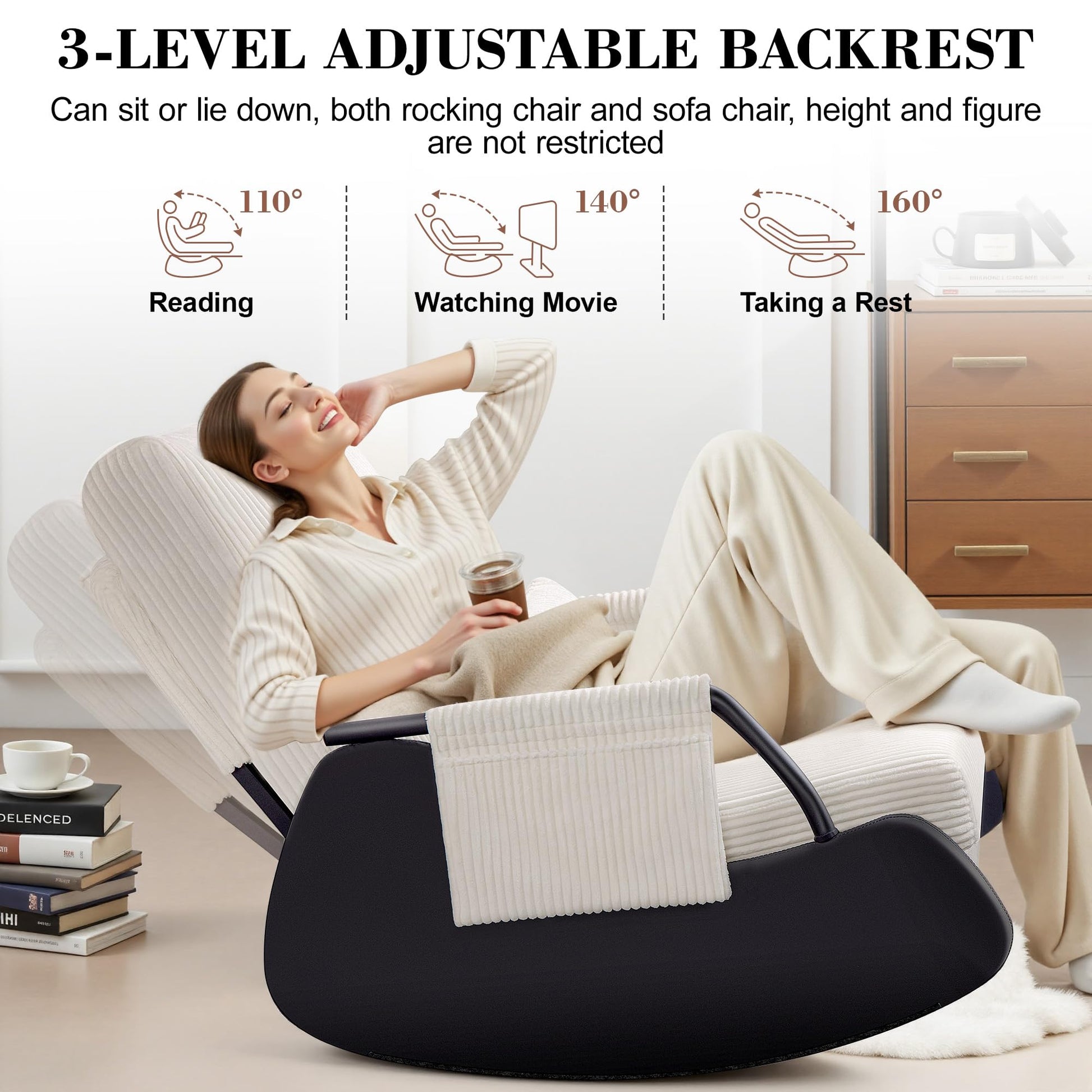 - ๐๐ข๐๐ ๐๐๐๐ญ & ๐๐๐ฃ๐ฎ๐ฌ๐ญ๐๐๐ฅ๐ ๐๐๐๐ค๐ซ๐๐ฌ๐ญ&๐๐ก๐จ๐ฎ๐ ๐ก๐ญ๐๐ฎ๐ฅ ๐๐๐๐๐ฌ๐ฌ๐จ๐ซ๐ข๐๐ฌ: This nursery rocking chair measures 24.8"D x 24.8"W x 31.5"H, offering plenty of room to relax. The 110ยฐโ160ยฐ adjustable backrest lets you sit upright for reading, recline for nursing, or nap in comfort. Includes a plush pillow, space-saving retractable footrest, and side pockets to keep essentials close while maximizing comfort and functionality