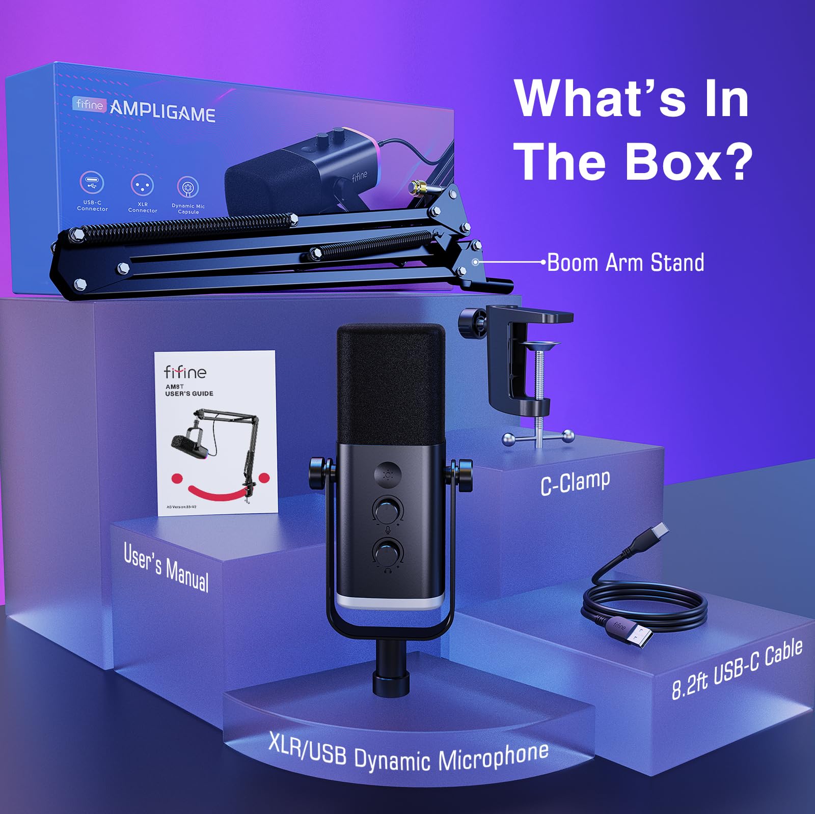 - Tips: 1) The desk clamp is suitable for desktop with a thickness of less than 2 inch. 2) AM8T package comes with dynamic microphone, Boom Arm Stand, C-Clamp, 8.2ft USB to USB-C Cable, User's Manual. 3) XLR cable NOT included.