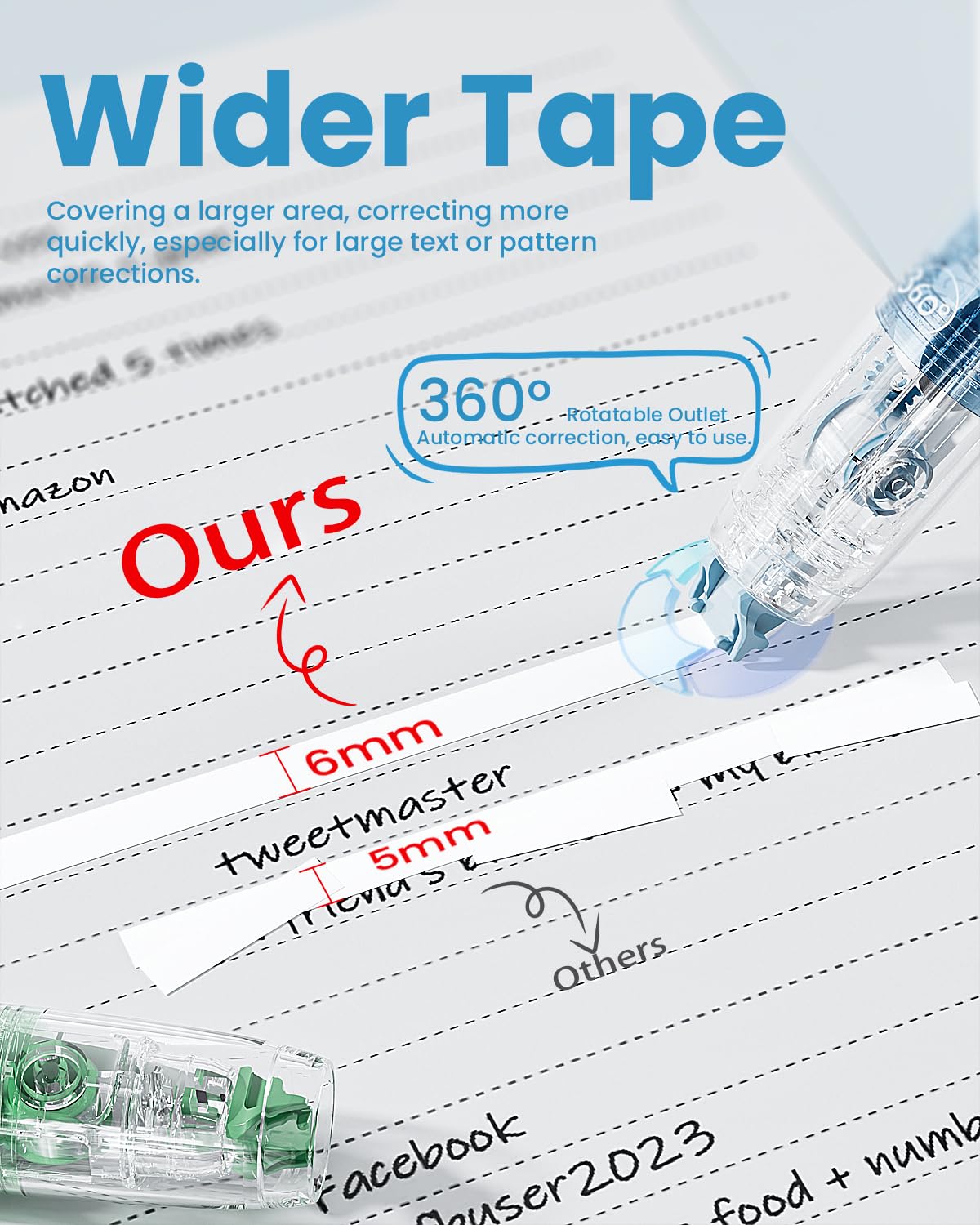 - Wider Correction Area: Featuring a 0.23-inch (6mm) width, this correction tape covers more area in a single stroke — ideal for fixing larger mistakes quickly. The wide tape also offers enhanced stability and control for a smoother, more accurate correction experience.