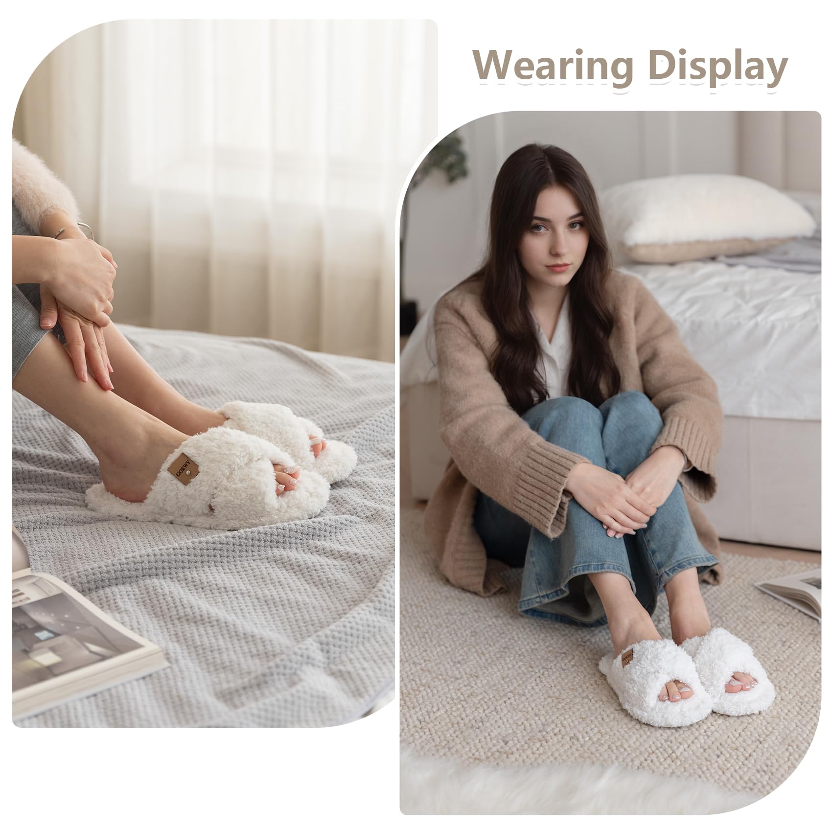GOEWY Fuzzy Open Toe Slippers for Women Indoor and Outdoor with Memory Foam Cozy Cross Band Cute Slipper Soft House Shoes Slip On Gifts for Women Mom Her Ladies Bridesmaid White