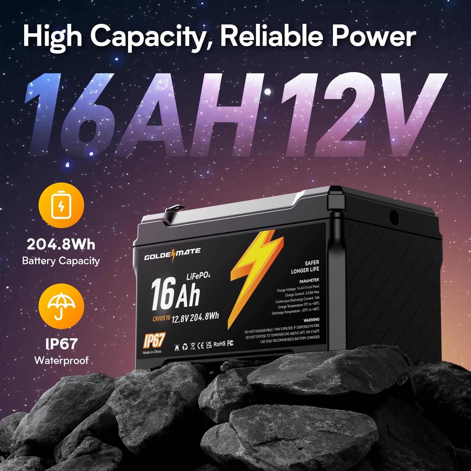 GOLDENMATE 12V 16Ah LiFePO4 Battery, IP67 Waterproof, 12V Lithium Battery w/ 5000+ Deep Cycles, Built-in BMS, Premium Lithium Iron Phosphate Cell, Ideal for Solar, Marine, Fishfinder, Off-grid camping