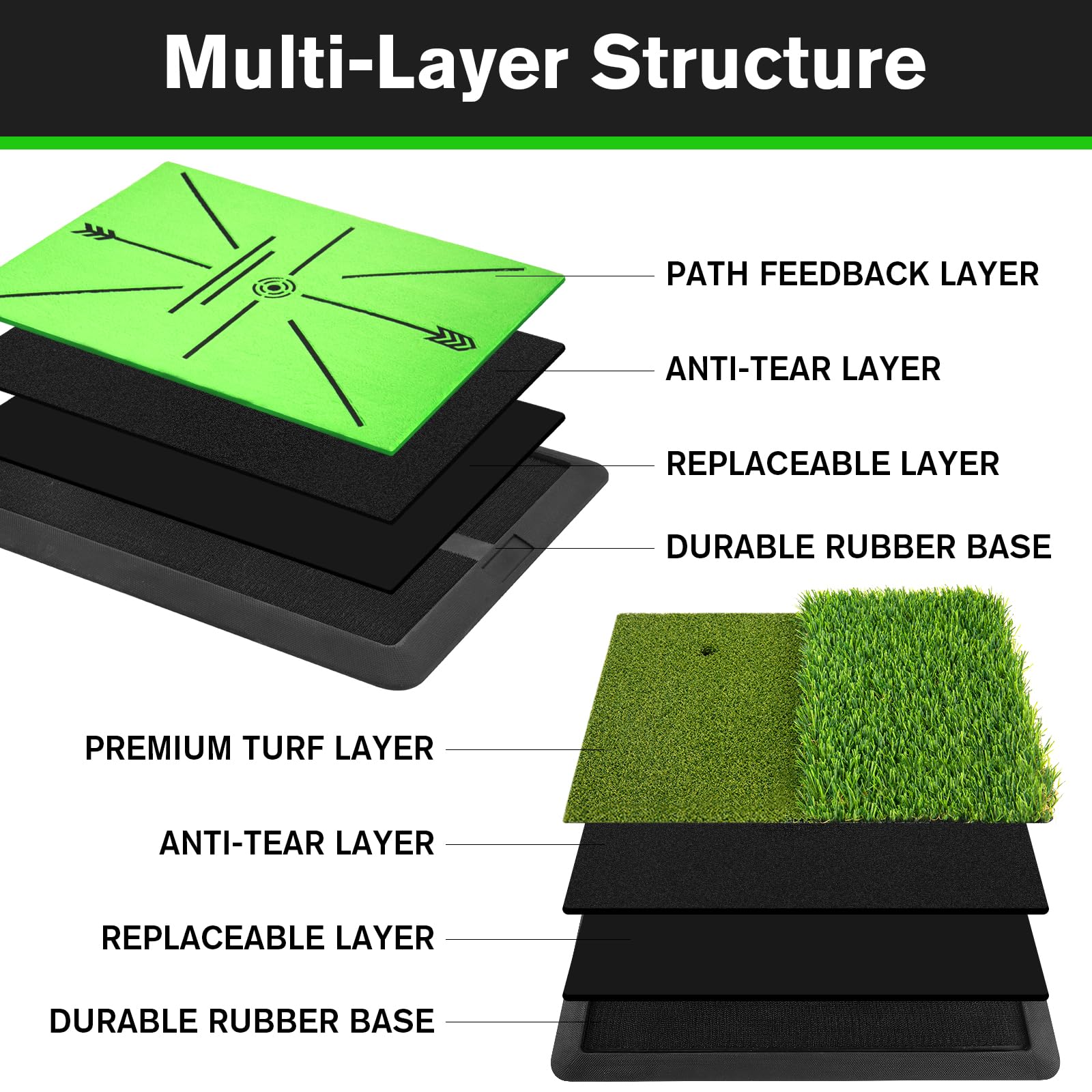 - Elastic Anti-Slip EVA Backing: Our golf mat euqipped with EAV material base,the elastic cushioning technology can absorb impact when swing or chipping on golf hitting mat.Also the gold mat with advanced texture of bottom to prevents the mat from moving when training.Those design not only protect your clubs and wrist but also provide maximum stability on any surface