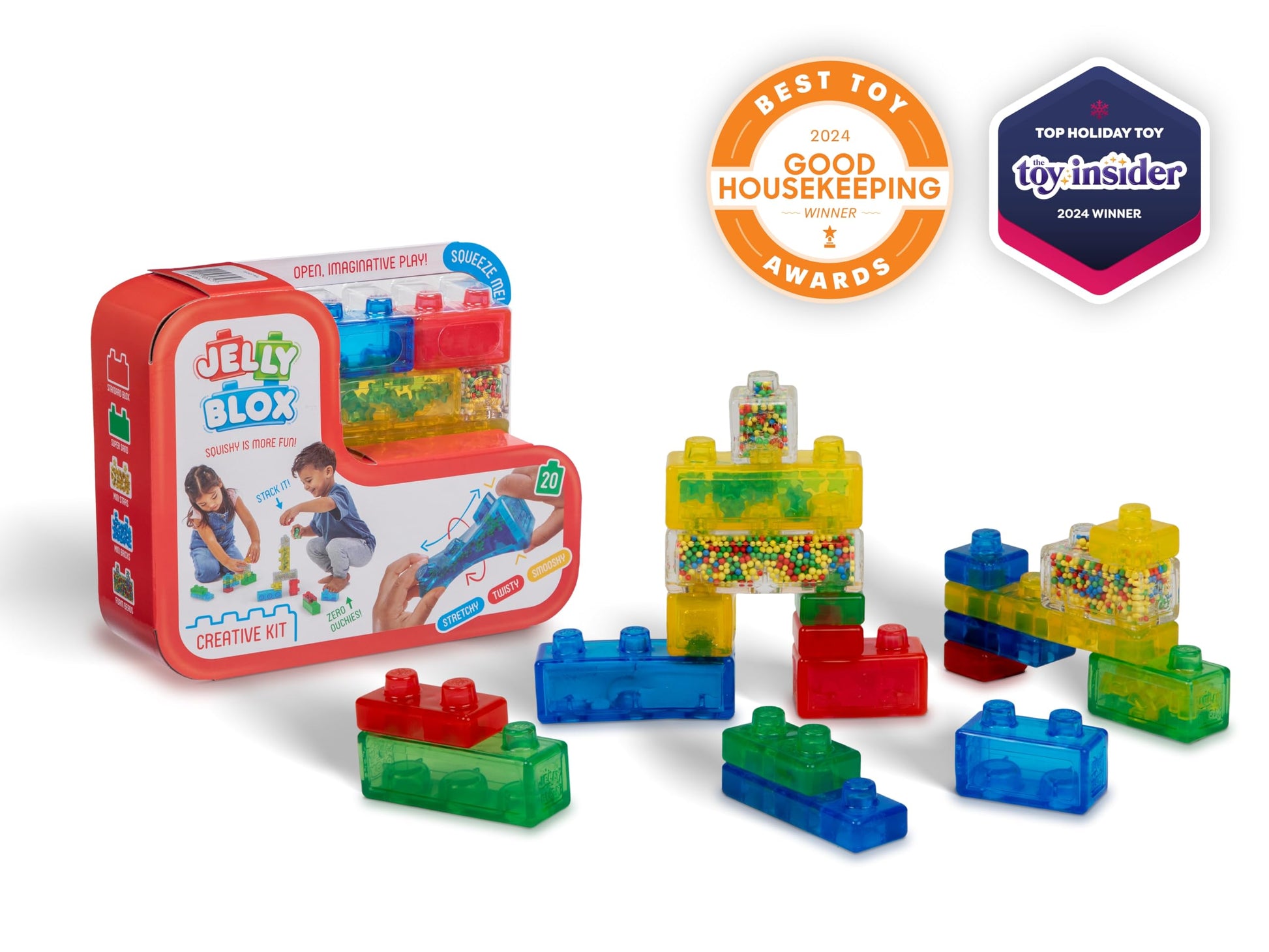 Details: Jelly Blox - the only blocks that bend the rules! Jelly Blox is a patent-pending building system for toddlers & preschoolers that kids can squeeze, stretch, and squish! Designed to support key developmental milestones through the fun of tactile, sensory play, Jelly Blox delivers jiggly construction fun. A few special blocks are also filled with fun sensory fills like sand, foam balls, mini stars, and mini bricks to dial up the fun! Jelly Blox are MESH Accredited - MESH accredited products are evaluated based on their ability to help children develop skills like problem-solving, perseverance, adaptation, conflict resolution, self-regulation, self-advocacy, cognition, and communication. Adults love Jelly Blox too! Oh, and a bonus for parents - not only are Jelly Blox safety tested to ensure worry-free play, but they’re also totally ouch-free; no need to dread those accidental encounters with bare feet! With Jelly Blox, it’s all about bending the rules and stretching the imagination! The Jelly Blox Creative Kit includes 20 blocks for hours of construction fun! Recommended for ages 2 and up.