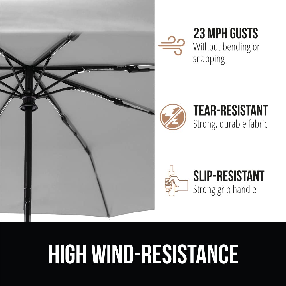 - HEAVY DUTY WIND RESISTANCE AND UV PROTECTION TESTED: the Gorilla Grip Umbrella is built for all weather durability; constructed with 8 reinforced fiberglass ribs and a tear-resistant canopy, the umbrella can tackle high winds without bending or snapping; windproof up to gusts of 23 mph; rust resistant for long lasting use, dry completely before storing; provides protection from harmful UV rays up to 20 UPF