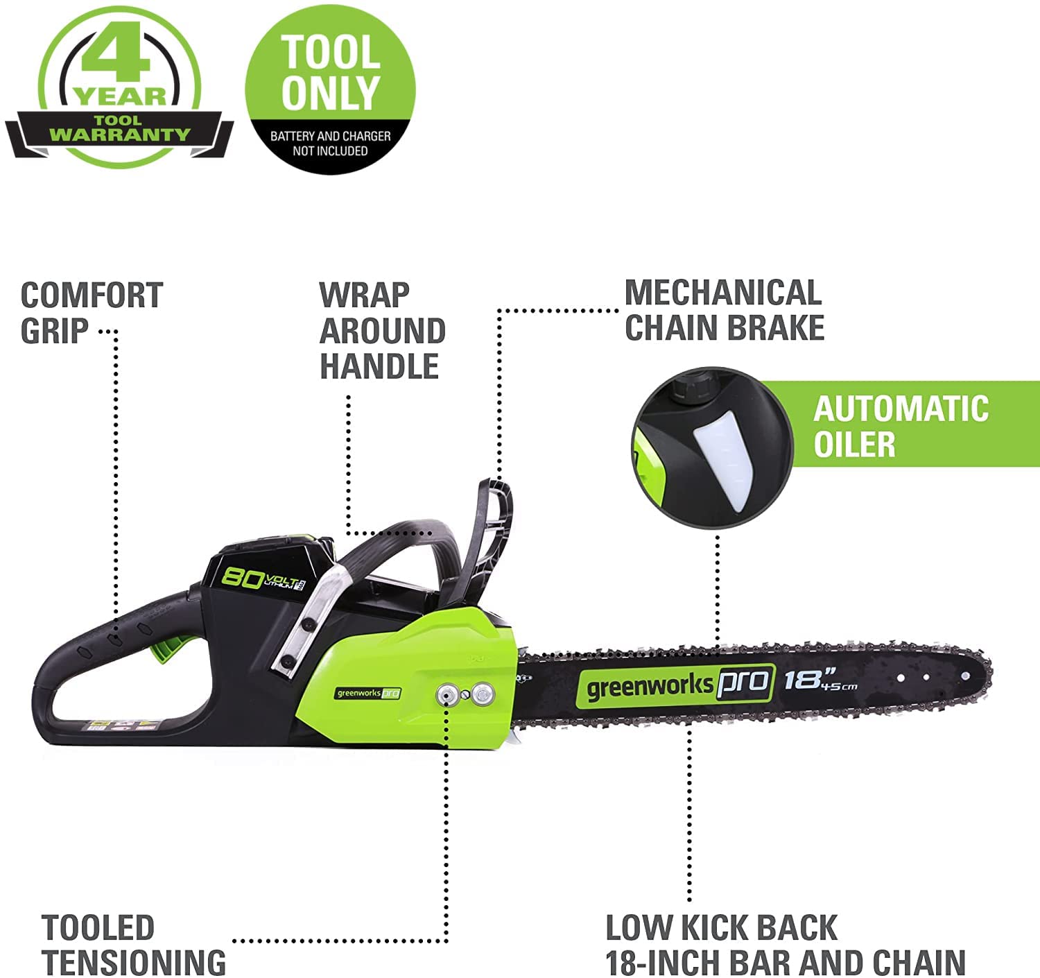 Greenworks 80V 18" Brushless Cordless Chainsaw (Great for Tree Felling, Limbing, Pruning, and Firewood) / 75+ Compatible Tools), Tool Only - Battery & Charger Not Included