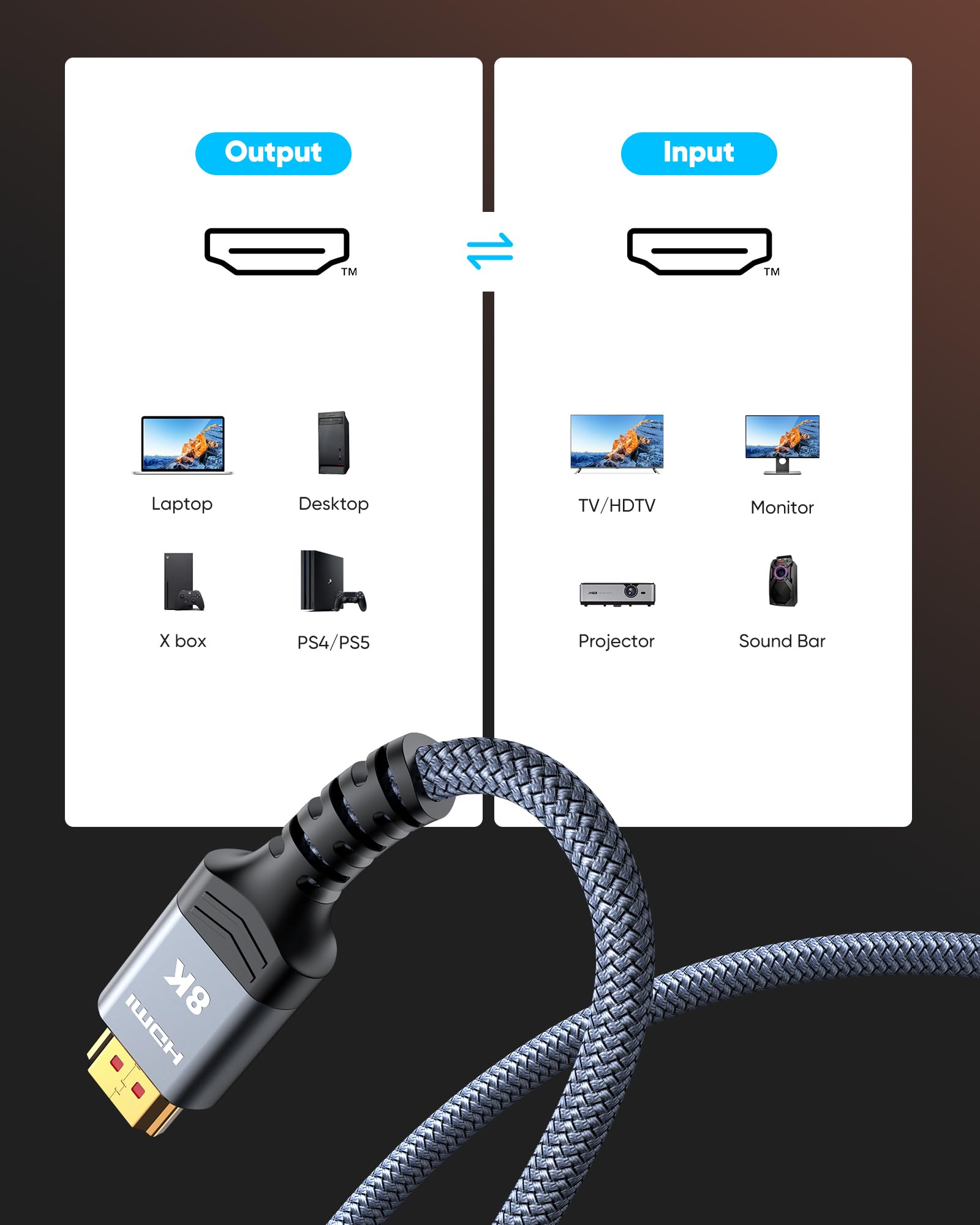 - Top Technology----8K@60HZ: This 8K Ultra High Speed HDMI Cable uses the most cutting-edge technology, is compatible with 8K@60HZ and 4K@120HZ, clearly displays every particle, and accurately processes every signal source.
