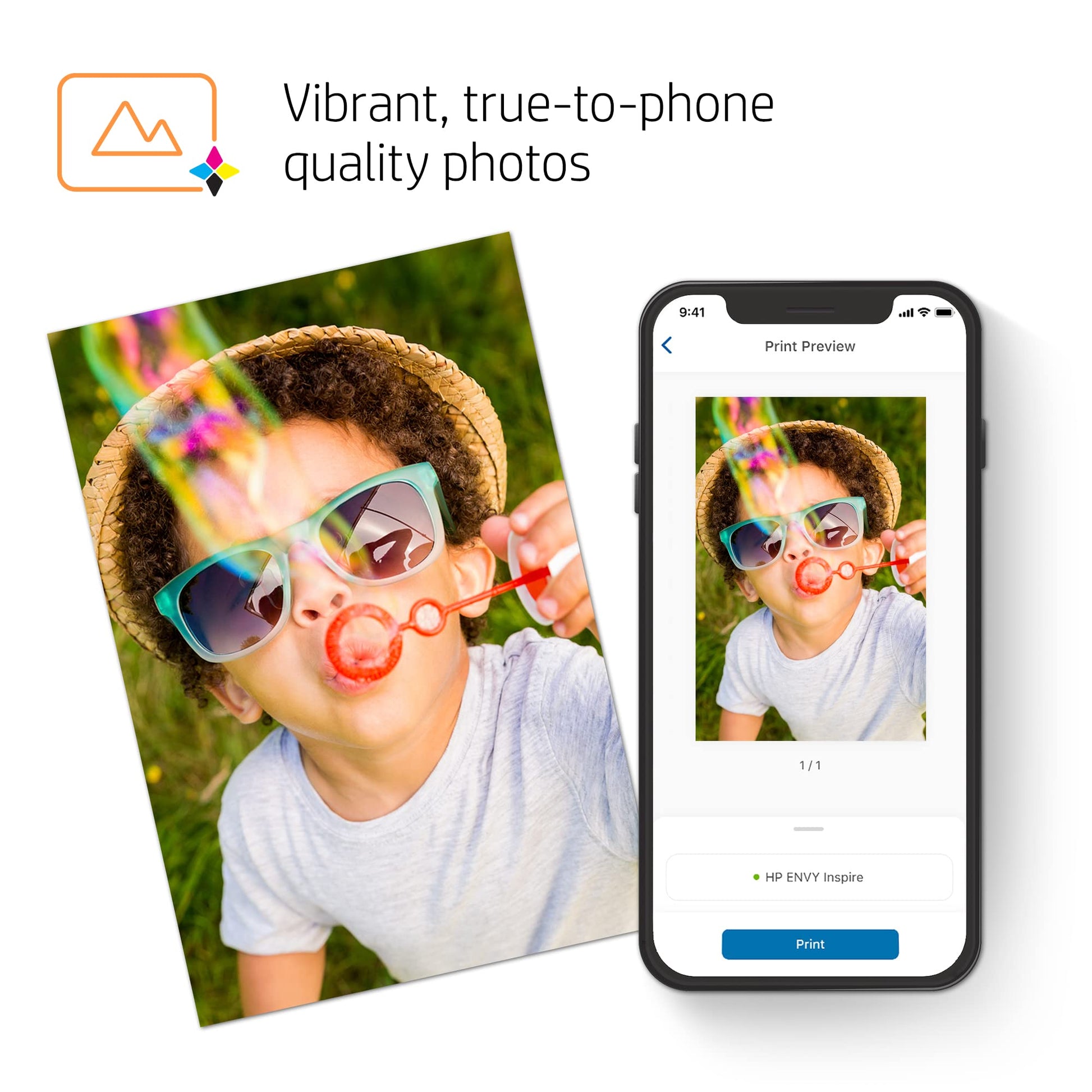 - VIBRANT PHOTOS – Photos that look as vibrant as they do on your screen with true-to-phone quality prints, plus custom photo features in the HP Smart app. HP 5x5" square and 4x12" panoramic photo paper sizes are optimized for the HP ENVY Inspire series