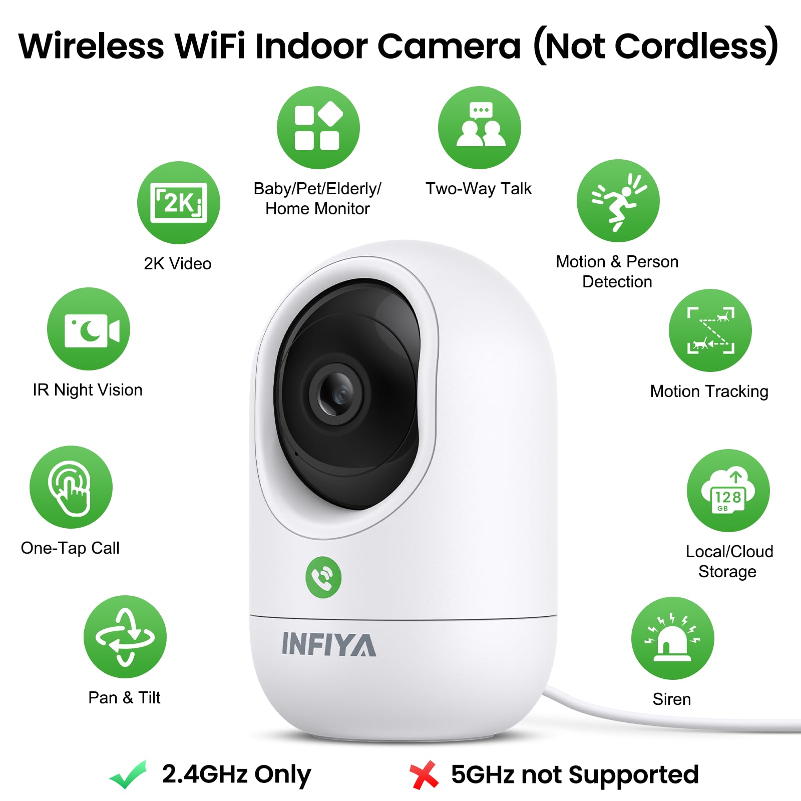 - High 2K Resolution with 360° Pan/Tilt & IR Night Vision: INFIYA wired home security cameras(only support 2.4GHz WiFi & 5GHz not supported & non-battery) present a crystal clear image in 1296P(2304*1296P), which captures more details. With a 355° Pan/Tilt, this home camera could be rotated up, down, left, and right via a phone app to monitor a wider point of view with everything in sight. Even at night, this security camera continues to work via infrared light. Safety is guarded anytime anywhere