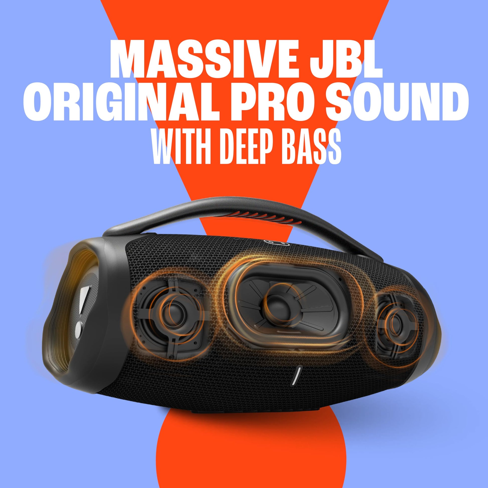 Details: We just made our most powerful portable Bluetooth speaker even better. The iconic silhouette of the JBL Boombox 3 has a bold new update featuring a sturdy metal handle with silicone grips, twin sidecaps, and waterproof and dustproof signature fabric. It’s been redesigned inside too, added with a new subwoofer unleashing much deeper bass and massive JBL Original Pro Sound, all with lower distortion. And 24 hours of play time takes you all the way from your morning workout to a late-night hang with your friends. And for sound that’s practically limitless, instantly connect multiple speakers with the JBL Portable app.