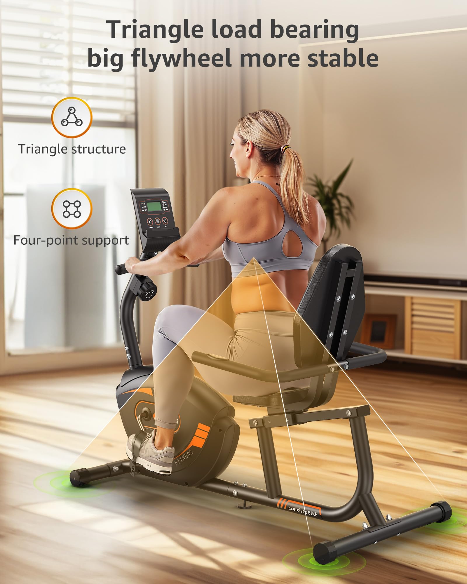 - Smooth and Quiet Recumbent Bike: The stationary recumbent bike uses strong neodymium magnets. The resistance is more uniform and the service life is longer. In addition, the craftsmanship of double belt system makes the experience smoother and quieter