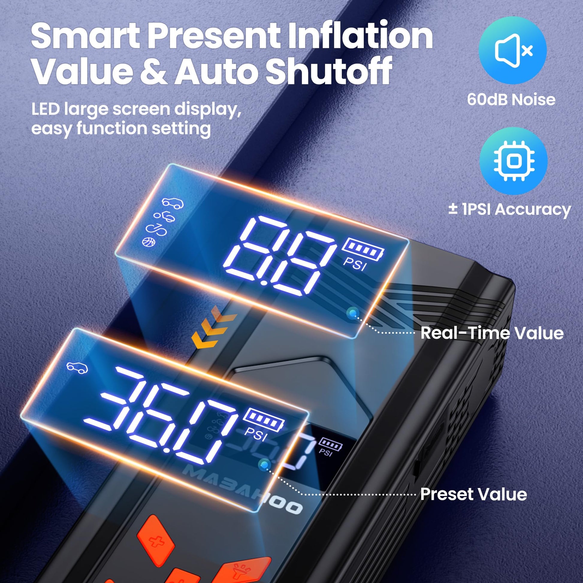- 【Cordless Tire Inflator with LCD Screen】Intelligent presets and auto shutoff. Long press the power button to turn on the device. With the jump Starter with air compressor, you can adjust the inflation mode at any time during inflation. It can quickly inflates a car tire to 20PSI in less than 1 minutes. This portable car jumper starter provides 4 preset inflation modes (car, bicycle, motorcycle, ball) and 4 units (PSI, KPA, BAR, Kg/cm²). LCD display to read real-time and tire pressure detection. 4 different nozzles for cars, bikes, balls for ease of use