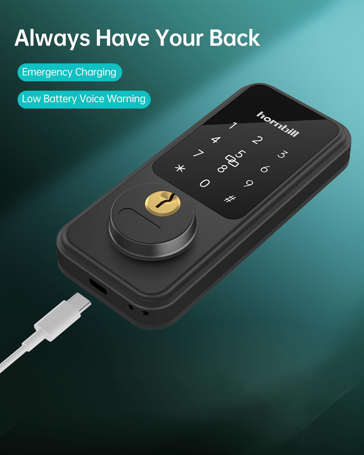 - 【Build to Last】After Multiple tests, hornbill Smart Front Door Lock Set can operate well under -4 °F-158 °F (-20℃-70℃) with an IP63 Waterproof Level. Feature Shock Resistance + Anti-Peep OLED Keypad + Heavy Duty Alloy + Long Battery Using Time (Approx 20000+ times Lock/Unlock).