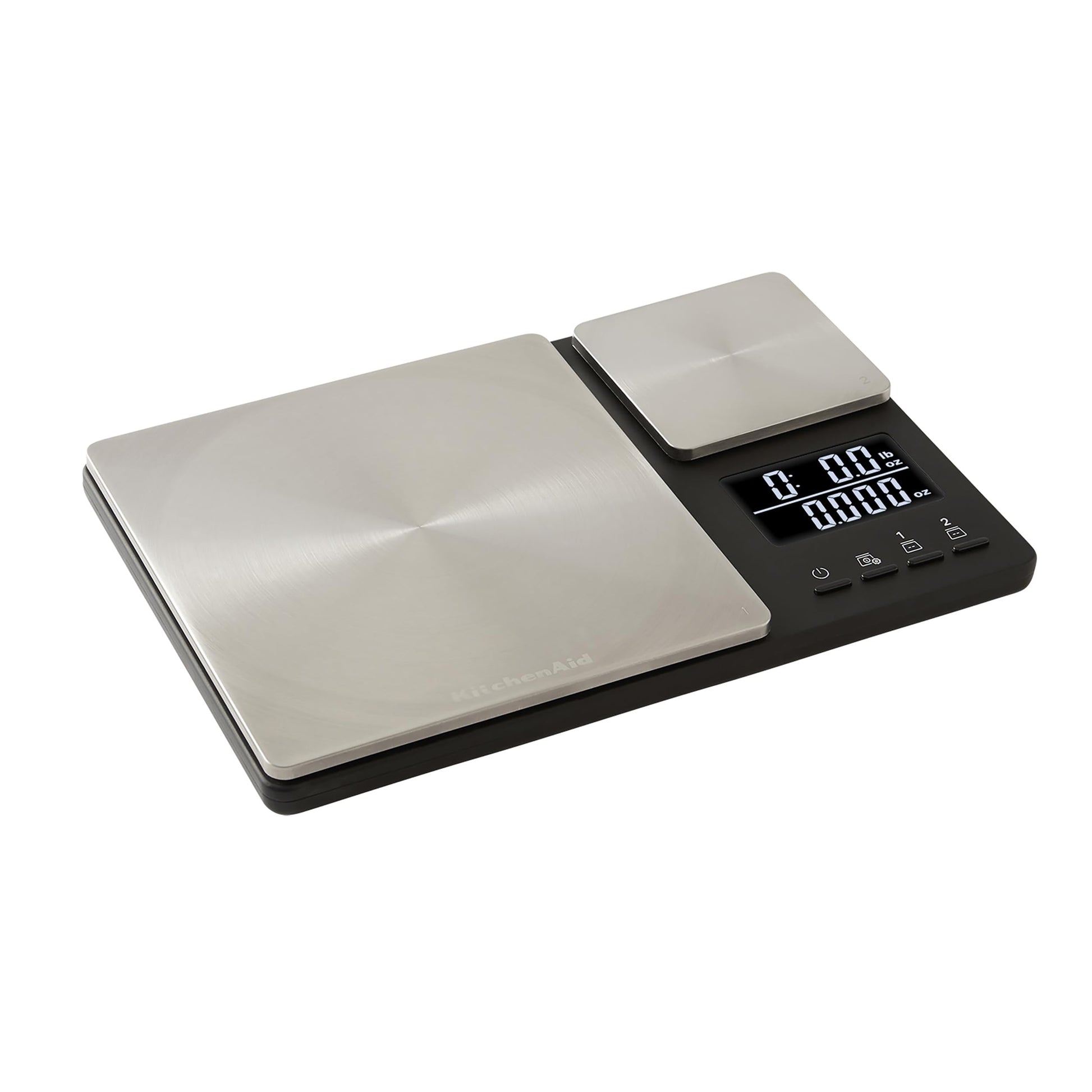 Details: This KitchenAid food scale is a high-performance scale with a double platform design. Two different weighing surfaces weigh larger amounts up to 11 pounds in 0. 1 oz increments like flours, and smaller amounts of 16 ounces in 0. 001 oz. Increments for ingredients like yeast and spices. Ensures perfect accuracy with scratch baking. The two platforms of this ultra-precise scale can work together or independently: a dual reading backlit display shows both weights. Each weighing platform has a Tare feature to zero out weights of containers or reset the display in between ingredients. The stainless steel platforms are easy to clean (just wipe down with a damp cloth). slim design stores easily.