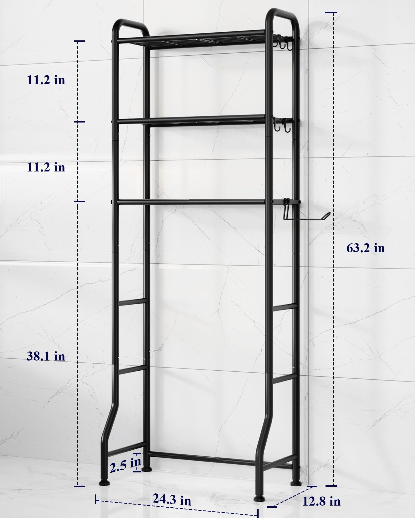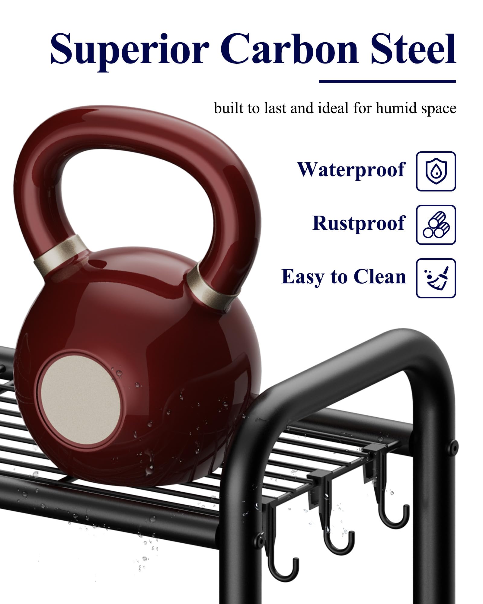 - PREMIUM CARBON STEEL: Crafted from high-quality carbon steel, this sturdy bathroom storage rack can support heavy loads without bending or breaking. Its waterproof and rustproof coating ensures reliable performance in humid environments like bathrooms and laundry rooms. It is designed to withstand daily wear and tear for long-term use. Besides, this bathroom decor is easy to maintain by wiping with a damp cloth.