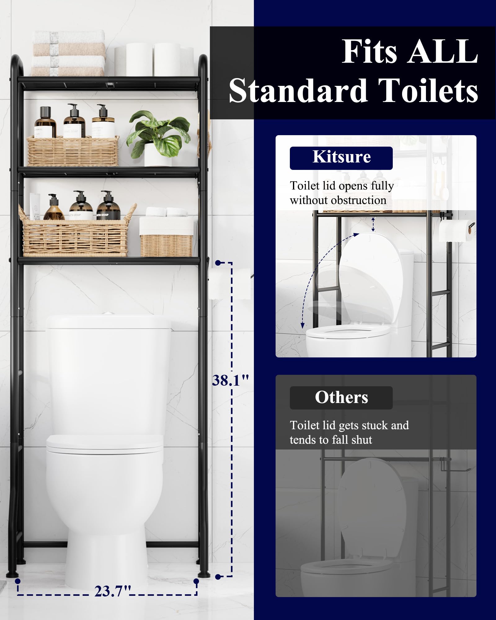 Kitsure Over Toilet Storage Rack - Metal Over Toilet Bathroom Organizer Shelf, Over The Toilet Storage Cabinet with Paper Holder and Hooks, Bathroom Cabinet for Laundry, Black, 3 Tiers (63.2" H)