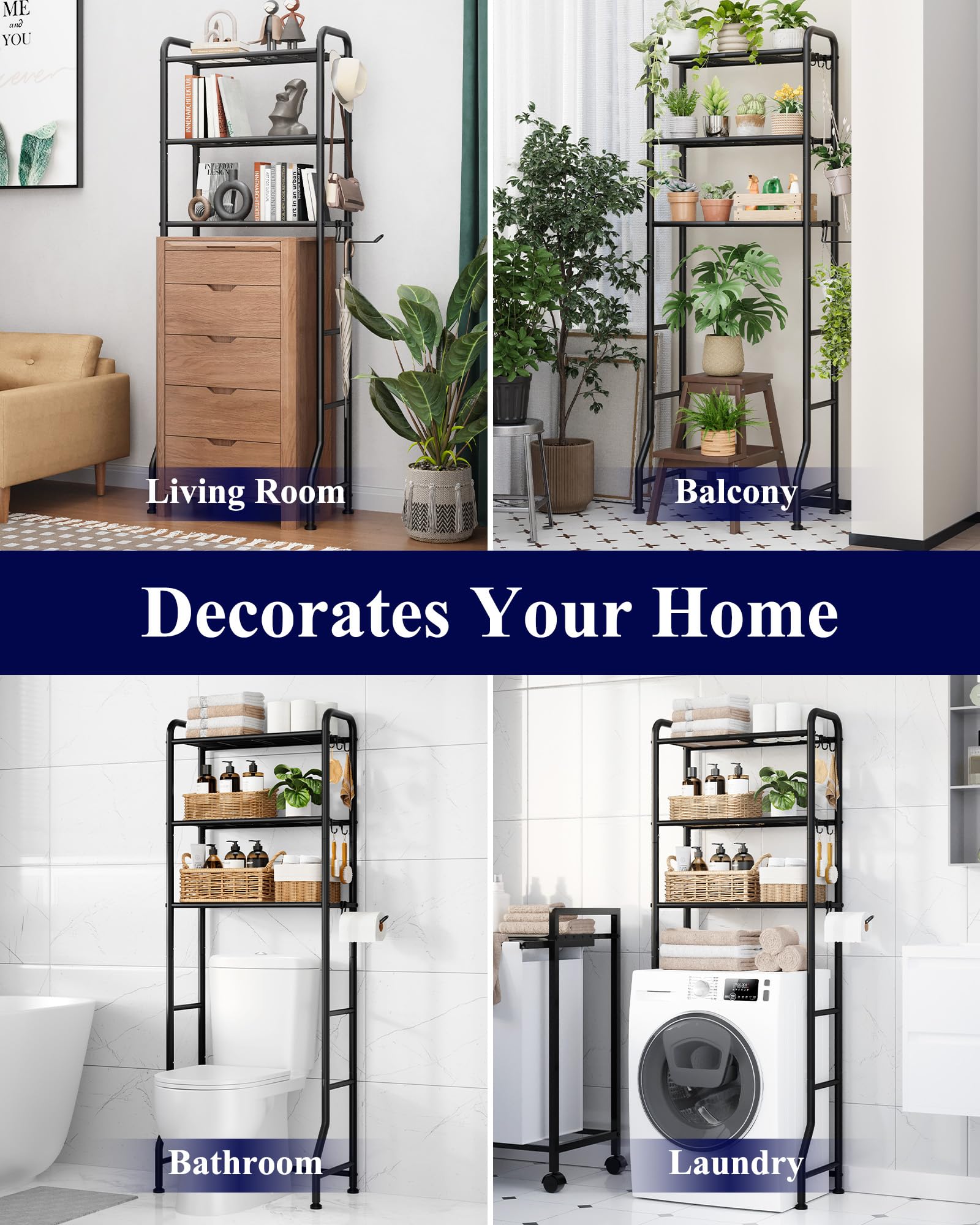 - DECORATE YOUR HOME: More than a simple bathroom shelf, this versatile and stylish metal rack effortlessly adapts to any space for extra storage. Use it in your living room for books and decorations, on the balcony to display plants, or in the laundry room over the washer for detergents and cleaning essentials. Its modern design complements any décor, combining practicality with elegance to elevate your home.