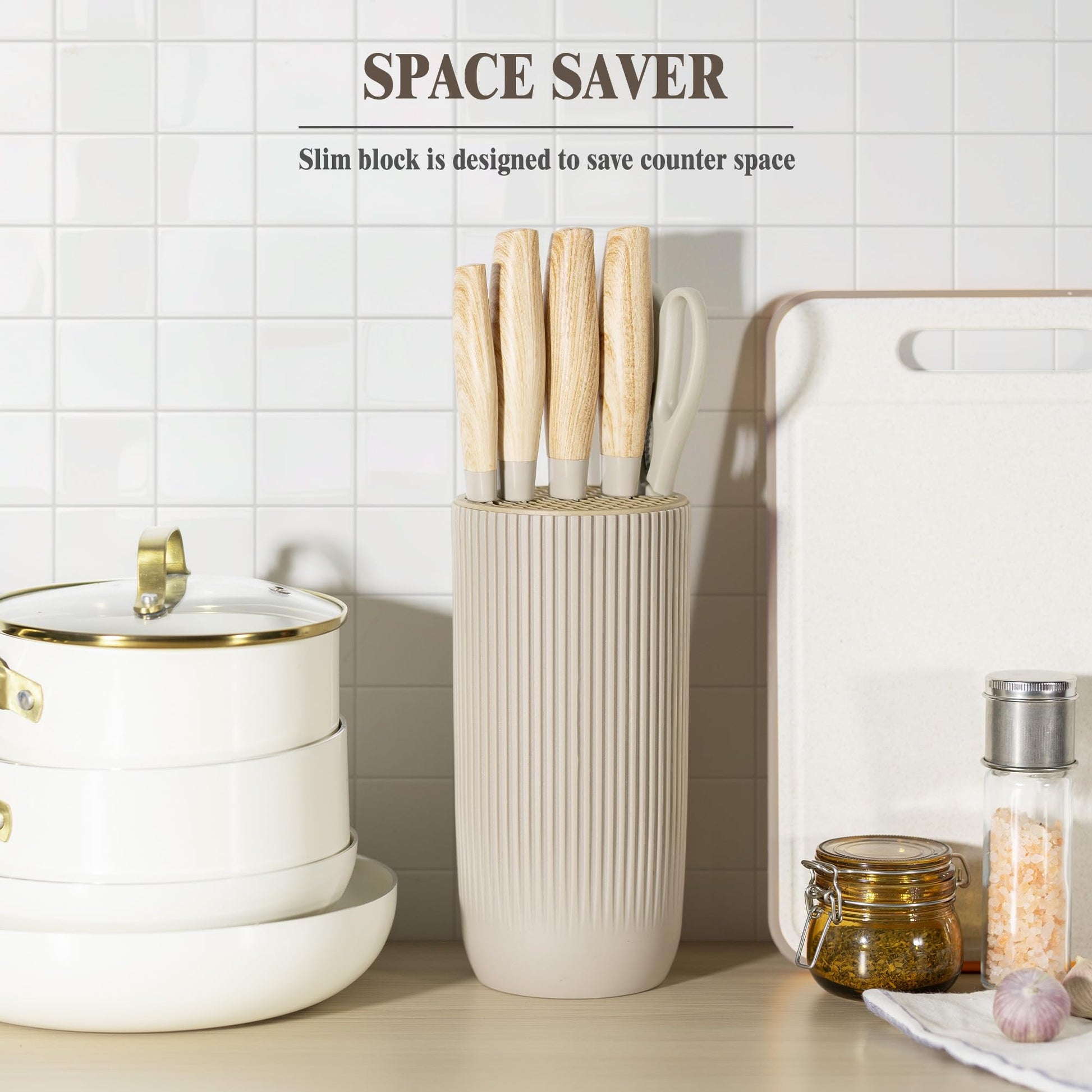 - 【Space Saving Knife Block】 Designed for modern kitchens, the compact knife block securely stores knives while saving valuable counter space. The smooth sliding design ensures effortless handling and accessibility.