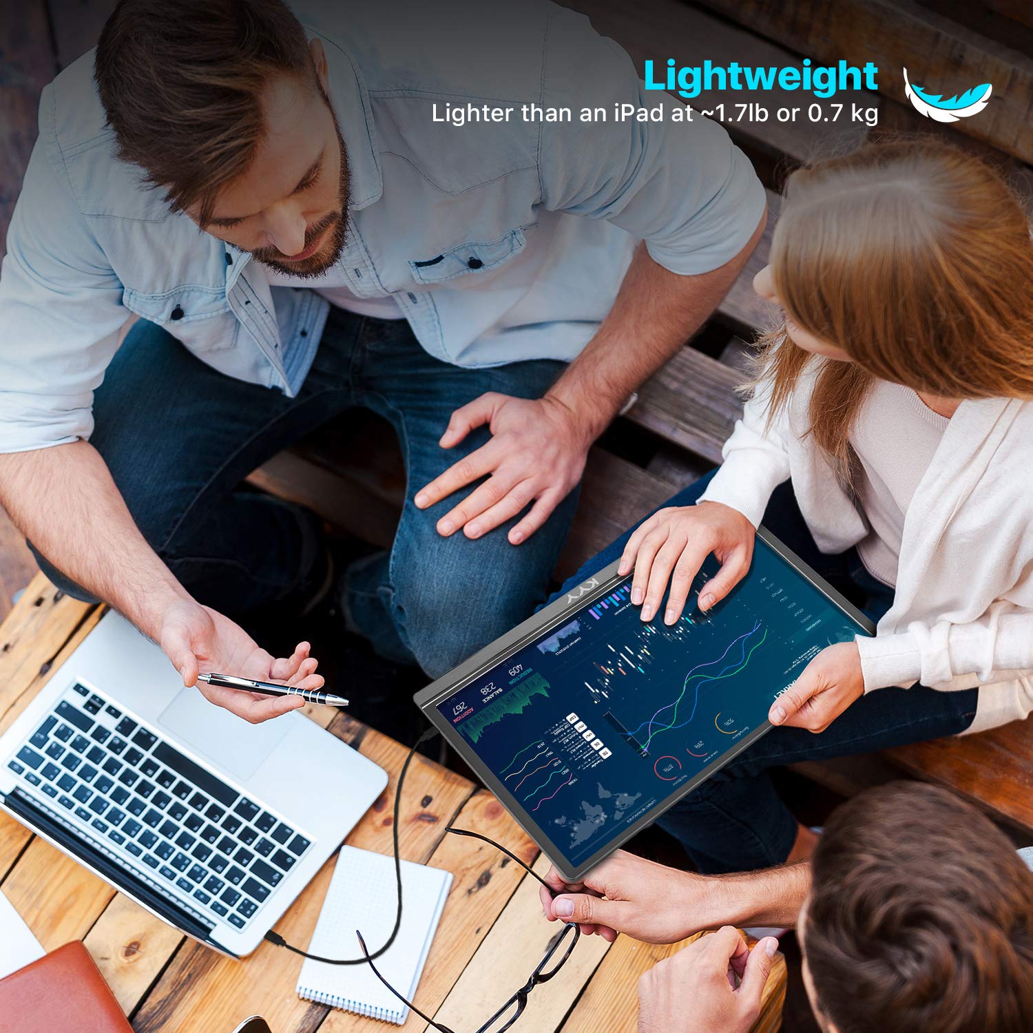 - [ ULTRA-SLIM PORTABLE DISPLAY ]: KYY USB C portable monitor features a 0.3inch ultra-slim profile(1.7lb), it is easy to slides into your bag, allows you to carry it everywhere, ideal for a simple on-the-go dual-monitor setup or extend your phone screen for movies or games. No driver needed and equipped with 3.5mm audio inputs and 2 built-in stereo speakers to enhance entertainment experience