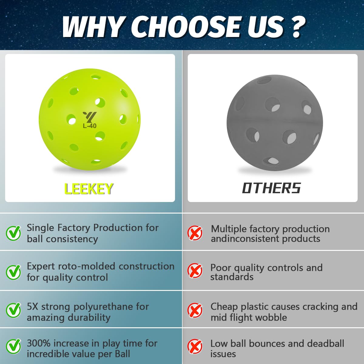 - Suitable for All Kind of Players : Unique bounce technology keeps the ball bouncing consistently and looking good on the outdoor & indoor court. Whether you are a beginner, professional, senior, adult, or young, our pickleball balls is a great choice for players of all skill levels