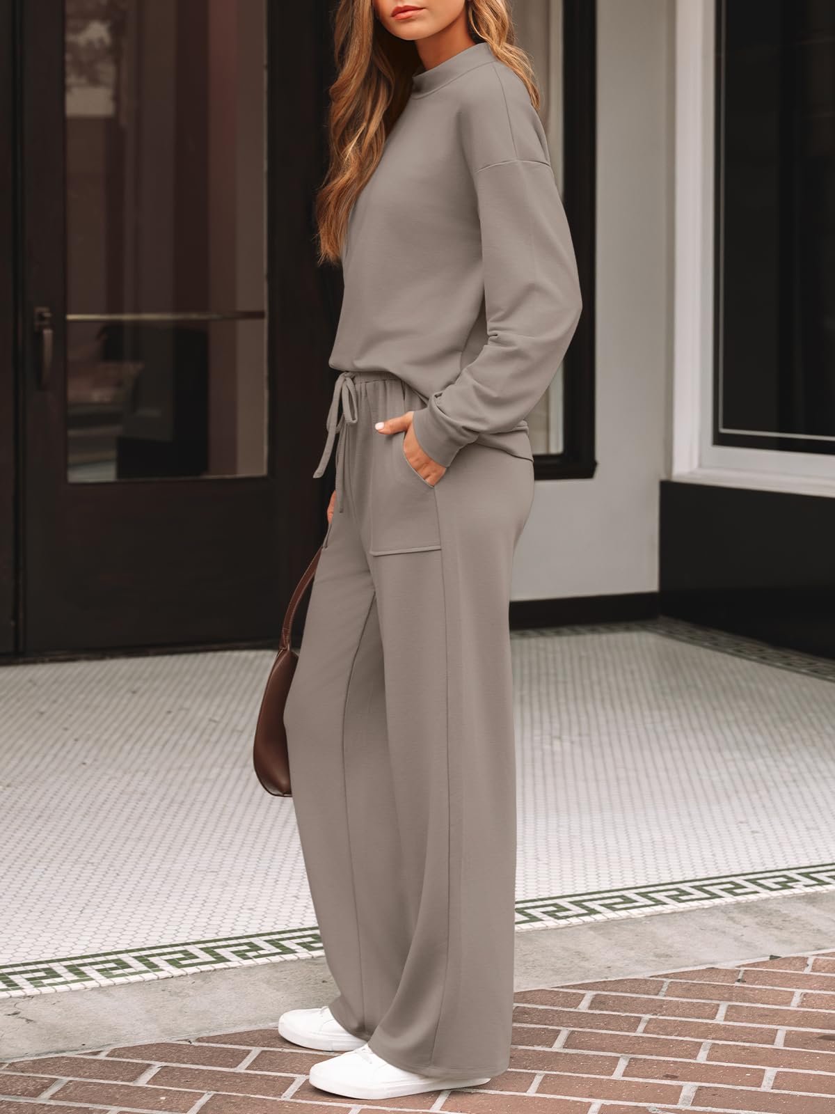 • Wear it as a coordinated set for a clean, head-to-toe look, or split it up. Whether you're crunching frost-kissed trails, grabbing a holiday latte, or curling up fireside, this half-high neck and pocketed wide-leg set bridges fall chill and winter frost with equal warmth and style.