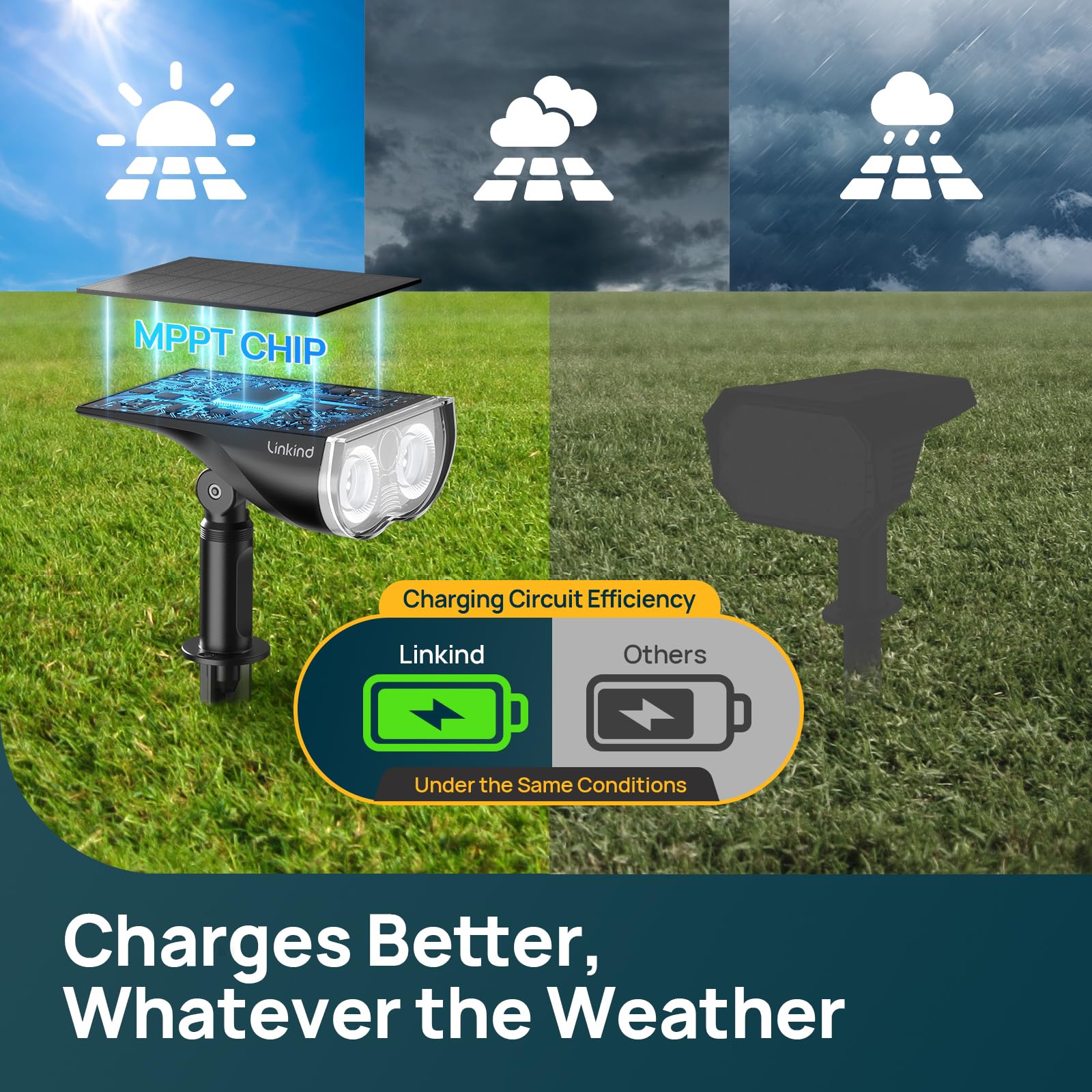 - 【Enhanced Charging Efficiency】Linkind SL5C is world's first solar spotlight using MPPT. With MPPT solar collection technology, charging efficiency is improved by up to 23.5% than industry standards. And with an 5C automotive-grade battery, you could enjoy up to 14 hours of continuous lighting.