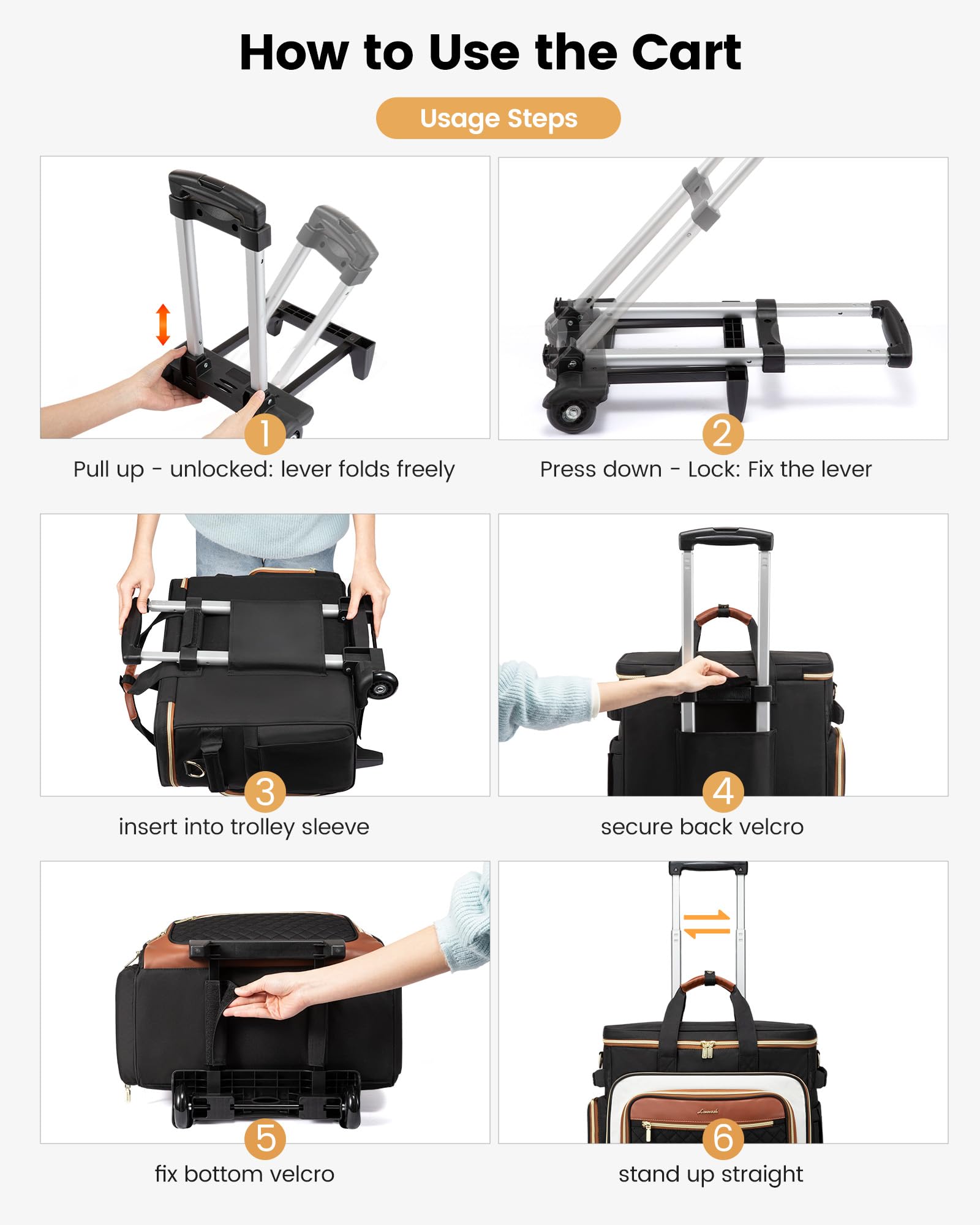 - 【Locked-in Stability Design】Designed to stay put and stay open. A quick-release top buckle secures the lid to the handle, creating a stable, open workstation for easy access. Heavy-duty hook-and-loop fasteners on the back and bottom firmly lock the work bag to the trolley frame, preventing slip or sway—even over curbs and bumps.