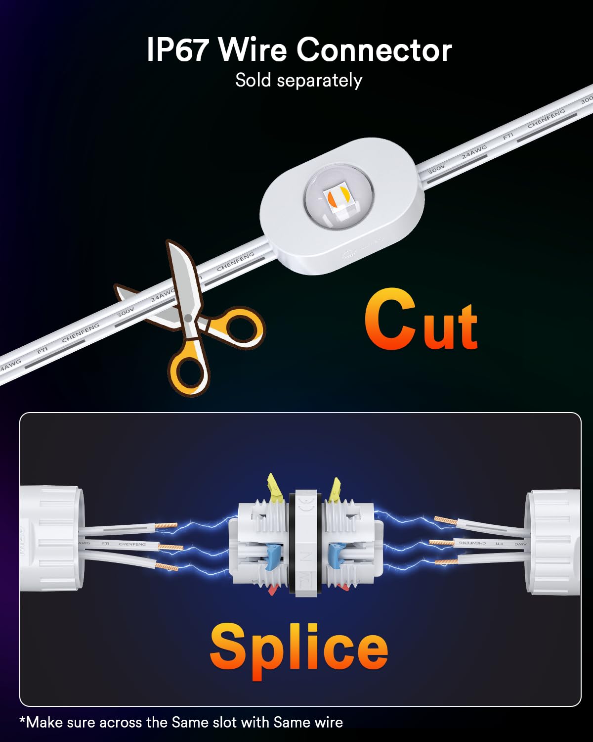 - All-Weather Reliability: Lumary year-round outdoor lights are IP67 waterproof with an IP65 control box. The 90/120 lights of adapter are IP67. They are crafted from anti-UV materials. Up to 50,000 hours and withstand extreme weather from -4°F to 140°F (-20°C-60°C). Note, IP67 Wire Connector, Extension Cabe and Wire Cover can be bought in Lumary. Support to add a extension cable between 2 strand of light. Not support to add another strand of lights