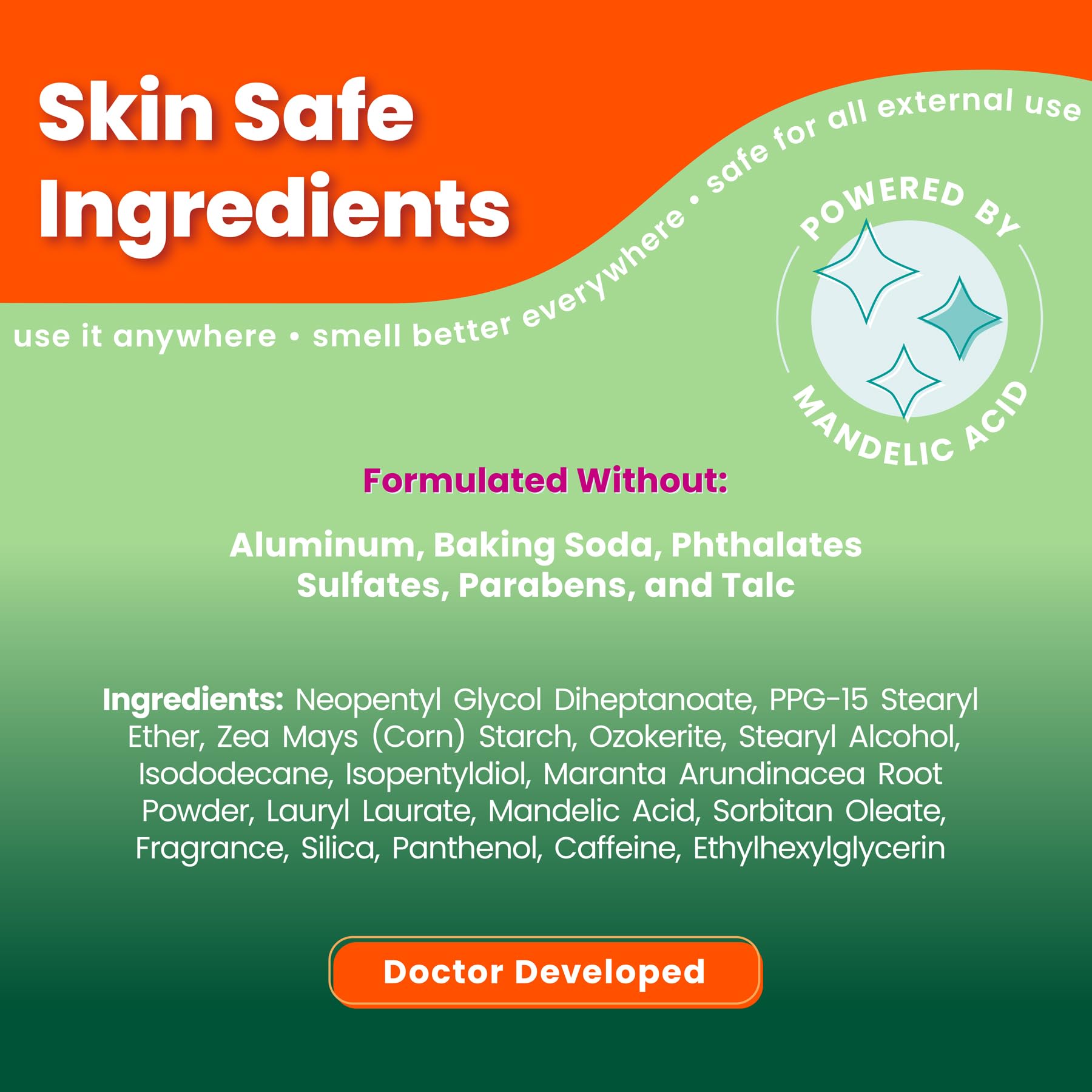 • SMELL BETTER EVERYWHERE - Odor control for pits, privates and beyond—think feet, underboob, belly buttons, tummy folds, butt cracks, thigh creases or anywhere else you have odor but wish you didn’t.