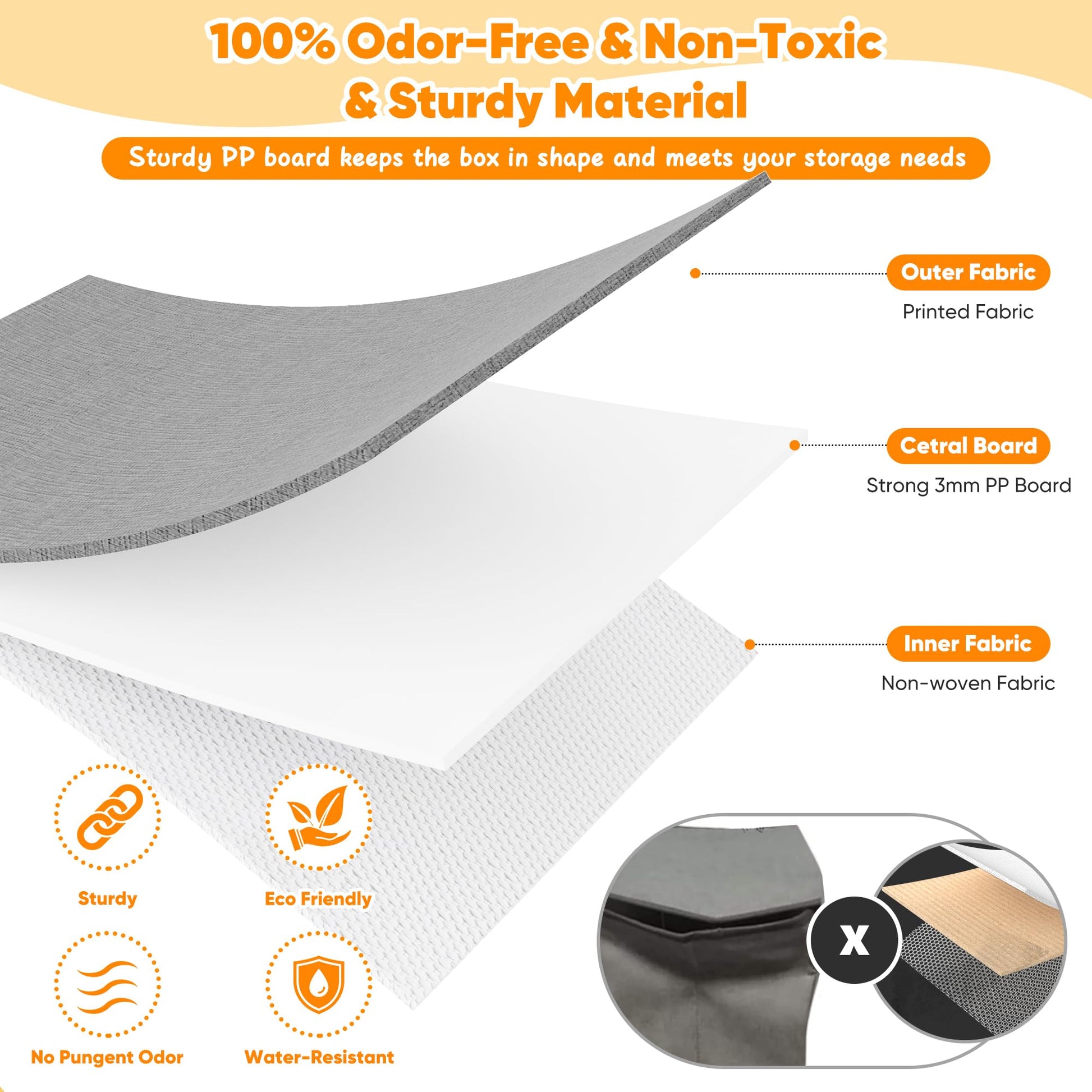 Our toy boxes are made of high-quality fabric and thickened PP board. The materials are sturdy, 100% odorless, non-toxic, and children can use them with confidence.