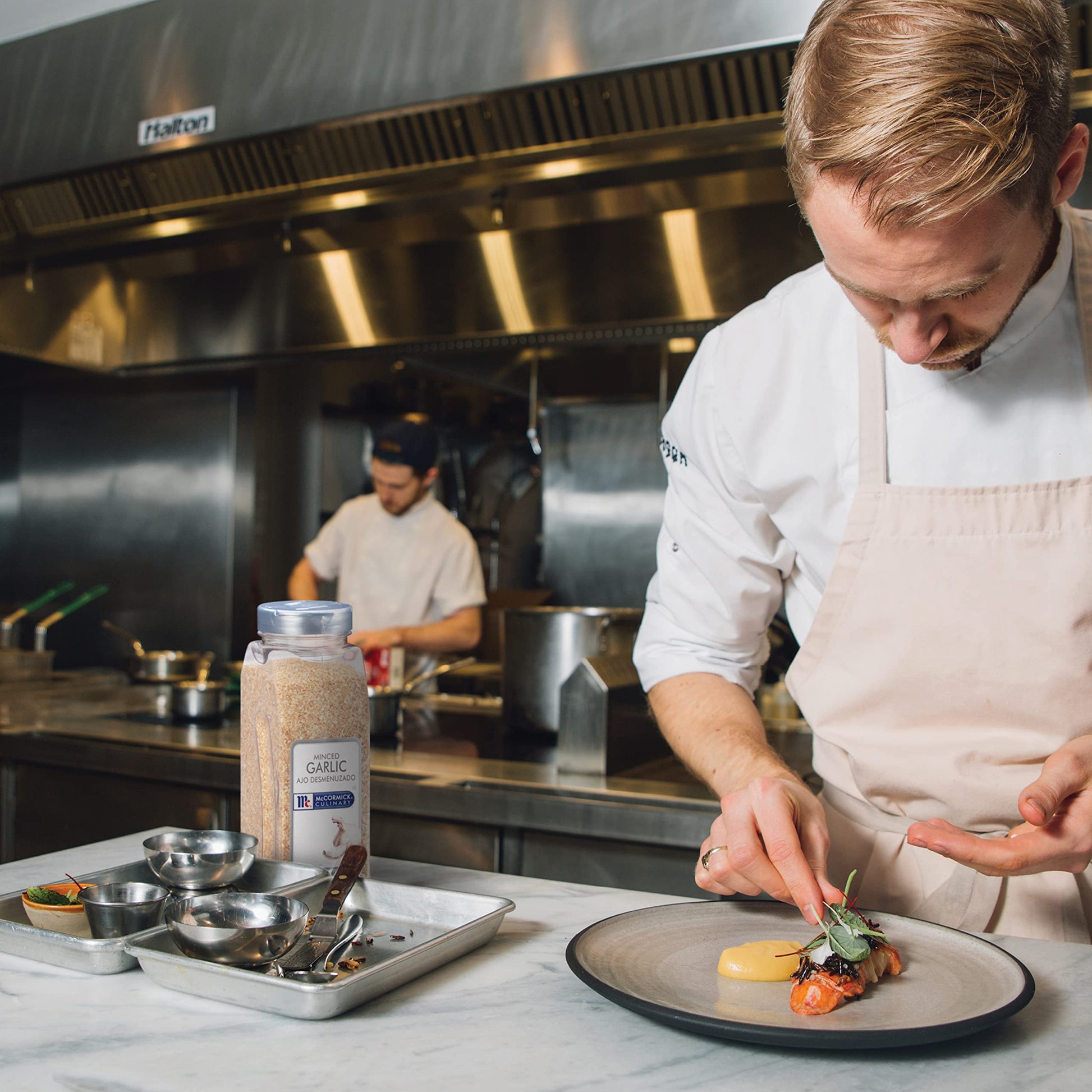 Details: McCormick Culinary Minced Garlic delivers consistent, natural flavor in every bite. As a product explicitly designed for culinary professionals, this seasoning makes it easy to experience premium quality and exceptional taste in the kitchen. Whether you add some garlic to one of your classic recipes or use it to inspire a new menu, you can always count on McCormick Minced Garlic to deliver a taste and texture your customers will keep coming back for. The minced garlic is freeze-dried and packaged into a 23-ounce container to maintain the flavor, texture, aroma, and color. This process ensures that the garlic will stay fresh in your pantry and have a long lifespan. Though this product is dehydrated, you can rejuvenate these pure garlic flakes quickly when you incorporate them in stews, soups and dressings.Instead of peeling and chopping fresh garlic frequently, purchase this container of dried minced garlic for a ready-to-use alternative that saves time and effort in the kitchen. It works well in all dishes that ask for fresh garlic. With its savory taste and incredible versatility, you'll get unbelievable value out of having bulk minced garlic on hand in your kitchen. Using dried minced garlic is quick is easy. Just substitute 1/4 teaspoon of the dried flakes whenever a recipe calls for 1 clove of fresh garlic. Try adding some to meat rubs, pasta and even pizza whenever you crave delicious food with bold flavors. You'll also find that garlic flakes bring the flavors in sauces, marinades, barbeque and even vinaigrettes together. Because it complements other seasonings, spices and flavors, you'll reach for dried minced garlic at every meal.From seasoning grilled chicken to livening up cozy minestrone, McCormick Culinary Minced Garlic offers countless benefits. Every bottle comes quality-sealed to lock in the fresh flavor, while the blend itself is kosher and made without added MSG.