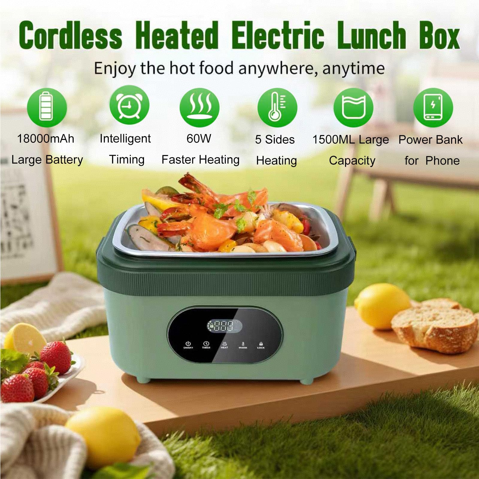 - 🔋 Massive Cordless Powerhouse: Enjoy true portability with a built-in 18000mAh battery—no outlet needed. This cordless electric lunch box delivers for multiple hot meals, making it the perfect self-heating companion for work, travel, or outdoor adventures.