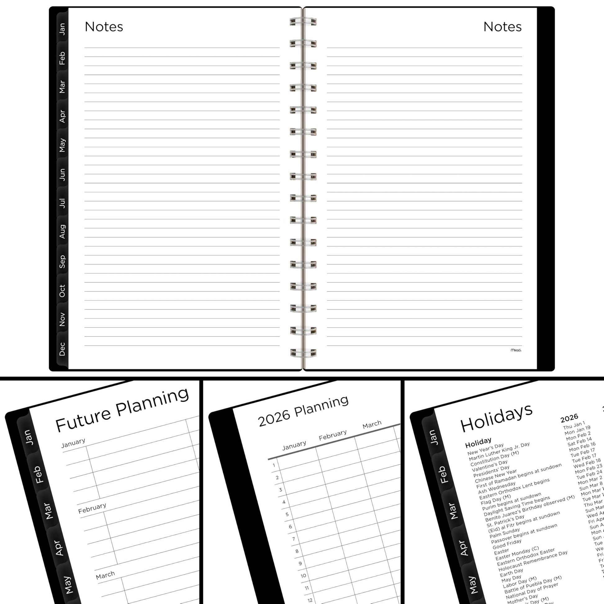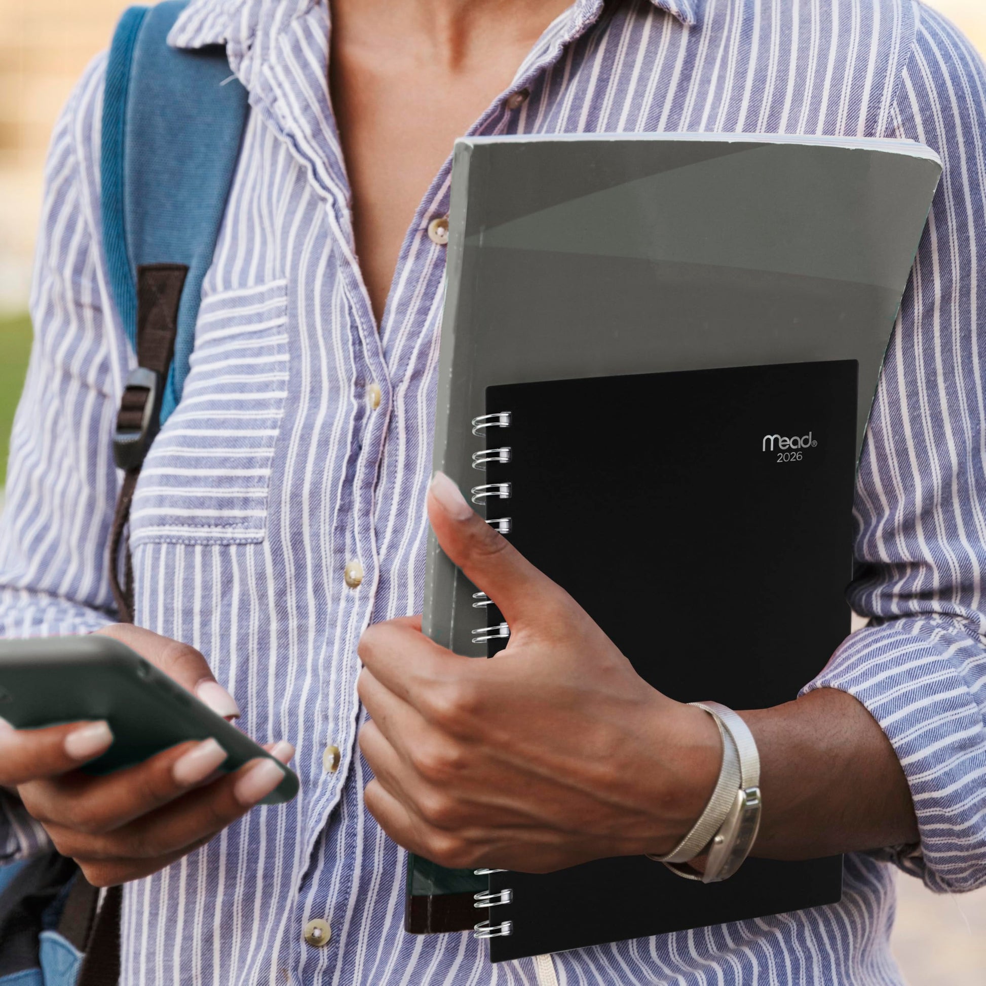 Details: Stay on top of every deadline, event and meeting with the Mead Basic Weekly Monthly Planner. This planner covers 15 months from October 2025 — December 2026 for a full year of planning and beyond. Weekly spreads have lined space for each day, which makes it easy to track your schedule. Current and future month reference calendars are shown on each page. Each month has unruled daily blocks, a column to jot down notes and two reference calendar blocks. Pages measure 5.5" x 8.5", with monthly spreads. Expand your organizational skills with special pages, including a 3-year reference calendar, future planning, a double-sided paper pocket and 20 total notes pages. Planner has a black cover and silver twin wire binding to help keep pages secure.