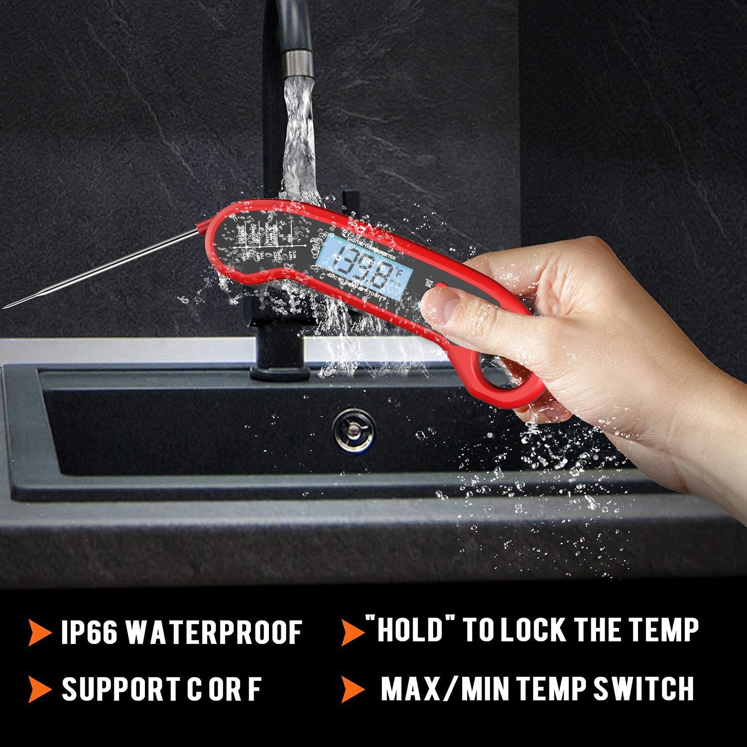 - Scientific Instruction and Easy using - We marked professional meat type and temperature reference on item body, keep the food tender and juicy. No more under-cooked food and stomach hurts. One-click operation, easy to switch Celsius and Fahrenheit according to different habits