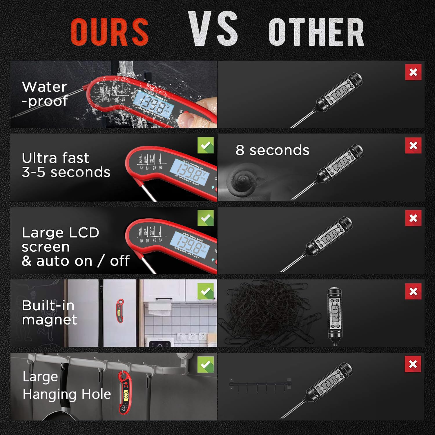 - A Must-have Outdoor BBQ Gadget- Large LCD Display for Instant Reading, Back lit designed can help you read clearly even in the dim outdoor BBQ night or the dense smoking grilling environment. The strong internal magnet and large hanging hole can be attached to the fridge/oven/hook for the handy storage