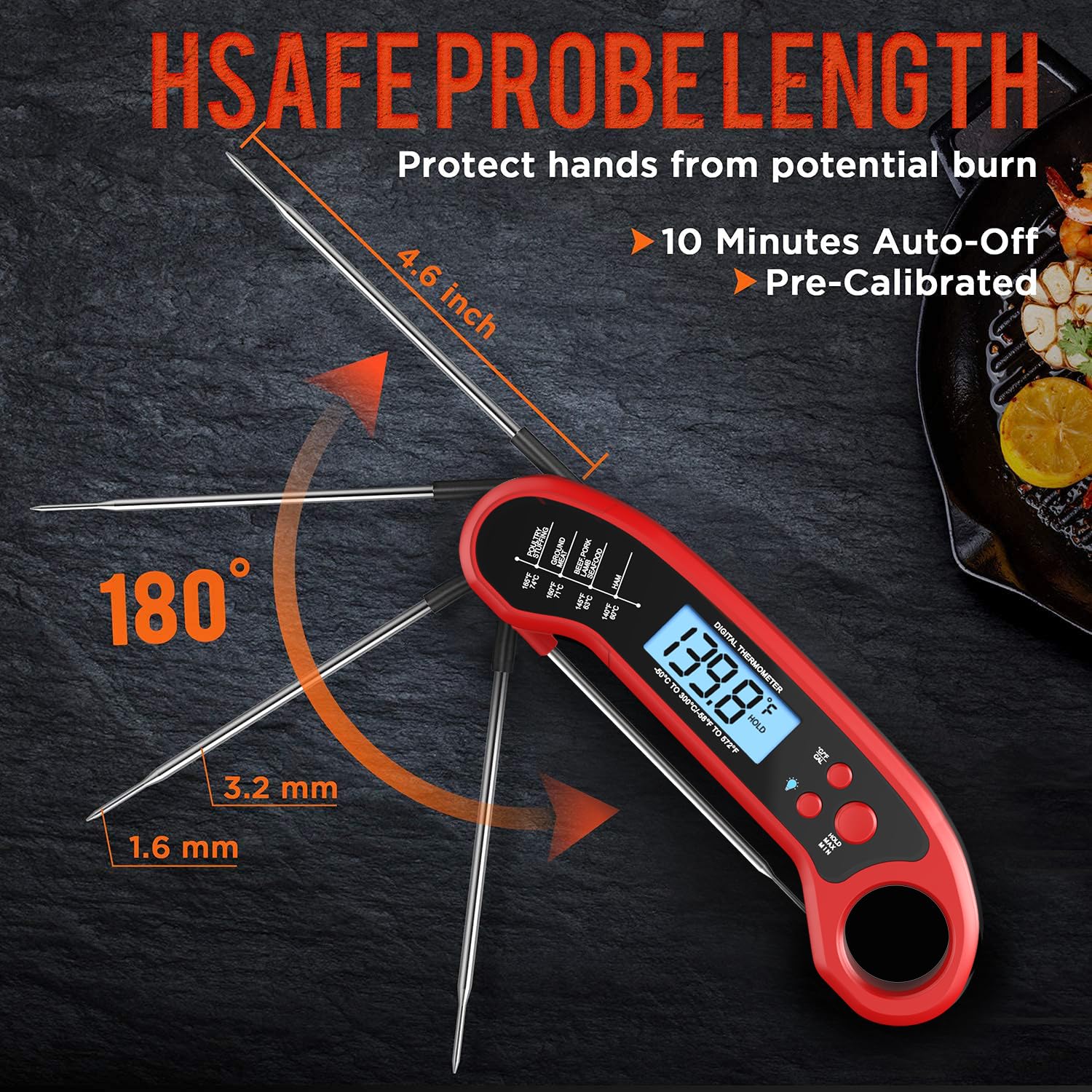 - Accurate and Sensitive Probe - 2-3s fast response time, measure food temperature from ice water to hot fries (range of -58°F to 572°F, the accuracy of ±1°F), 304 stainless steel probe is safe and food grade that you can feel free to use it on children's and baby food