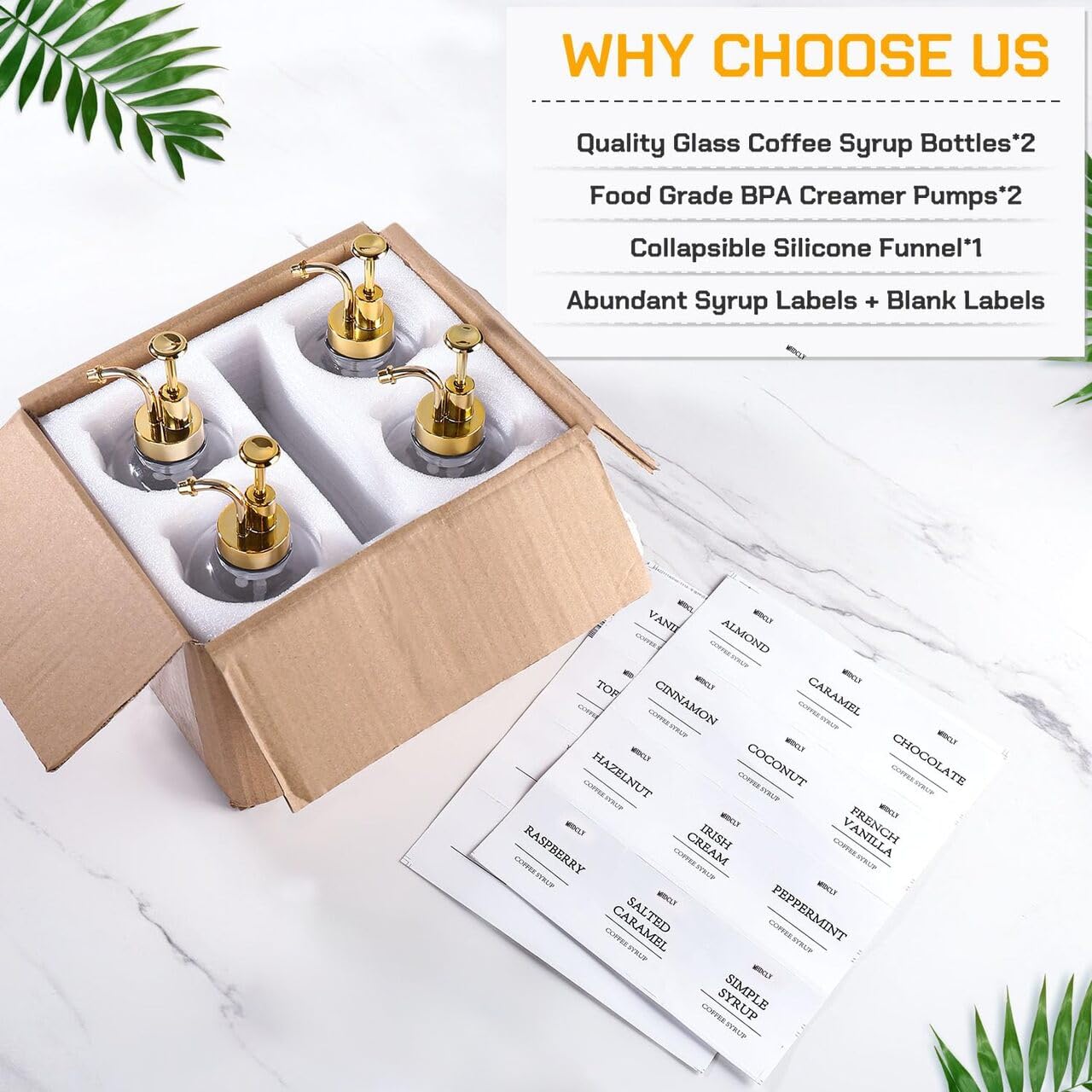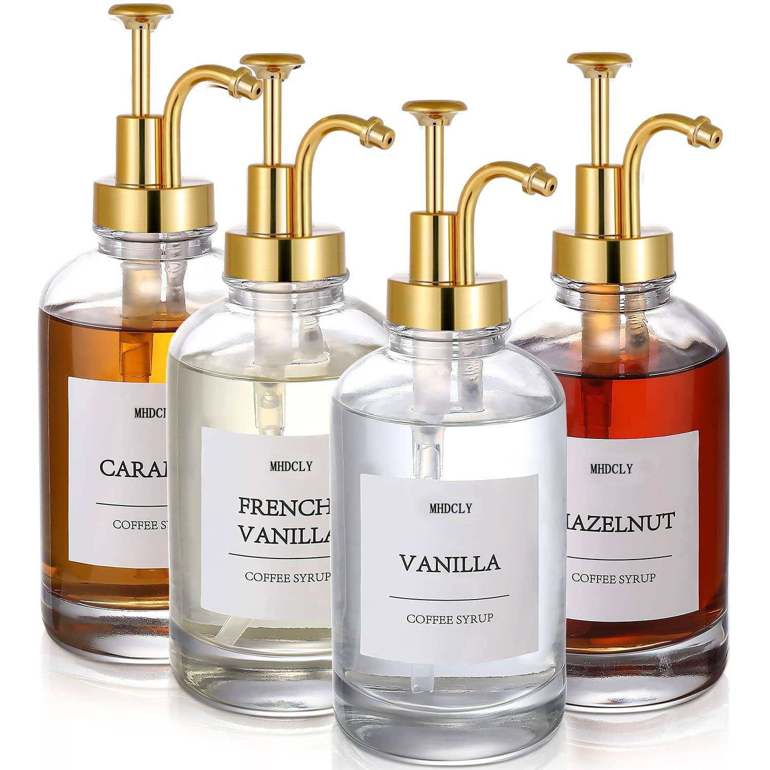MHDCLY Coffee Bar Accessories, Coffee Syrup Dispenser - 4pack,16.9oz Syrup Dispenser with Labels,Syrup Pump Dispenser for Coffee Bar(Gold pump)