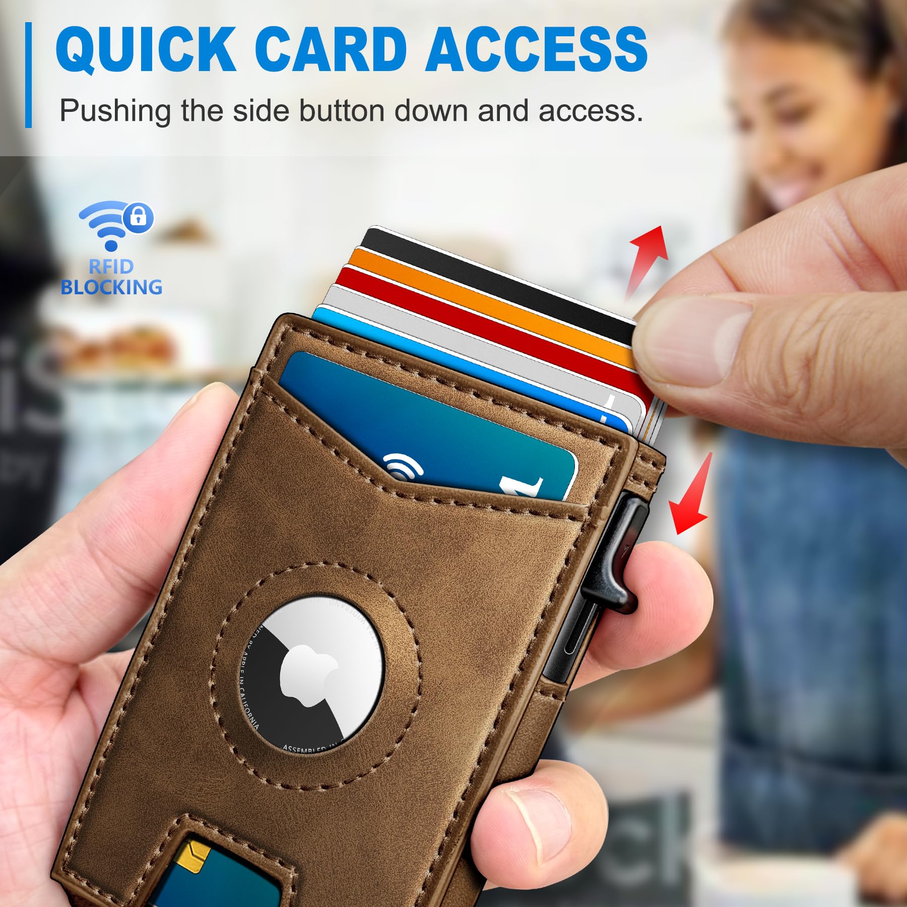 • AMPLE STORAGE--Easy for 9 cards and holds Airtag,Slim wallet with refined layout to fit in front pocket,the money clip with Leather wrapped for carry cash,5 cards in the aluminum case with pop-up access,4 cards in the leather shell;