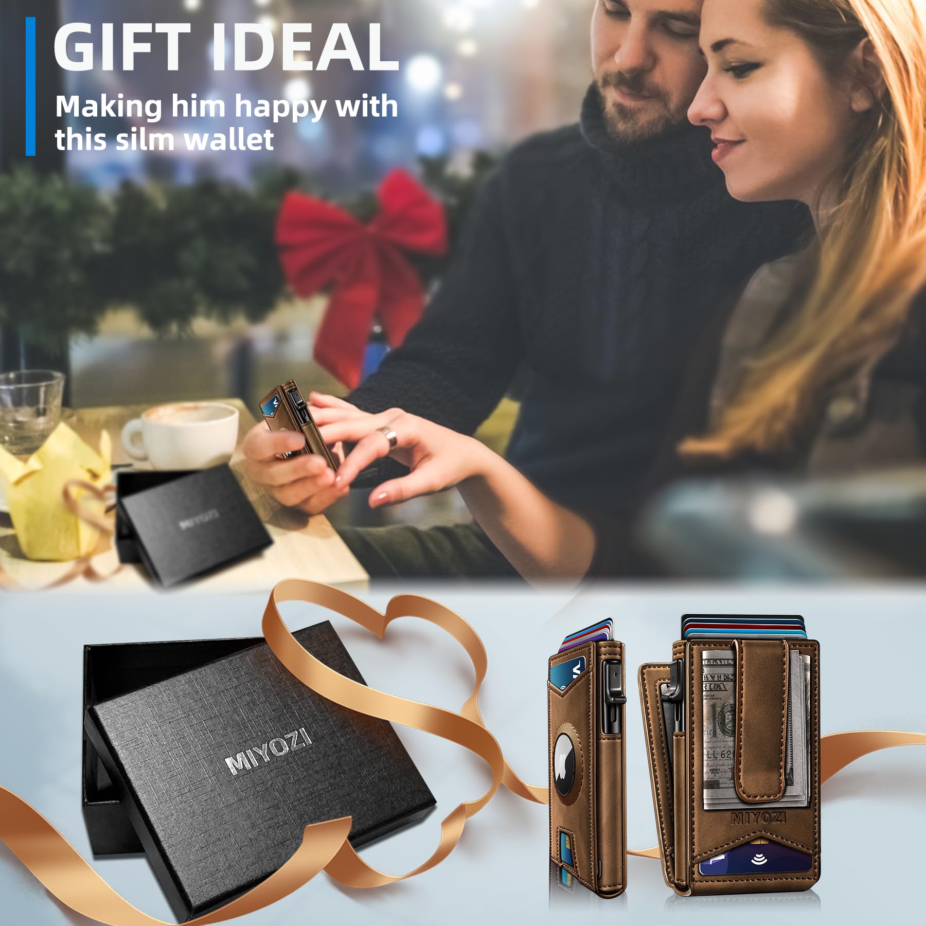 miyozi Airtag Wallet for Men,with Money Clip Gift Boxed,Slim Front Pocket Wallet RFID Blocking Metal Case Smart Pop-up Credit Card Holder in Magnetic Leather Flip