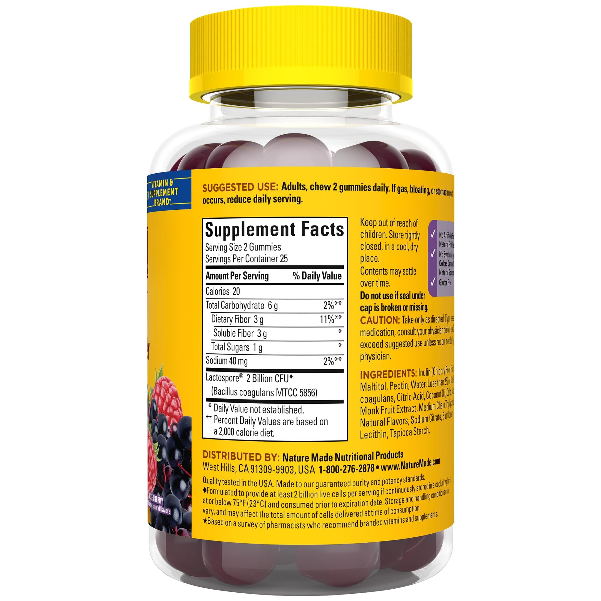 Details: Nature Made Probiotic + Prebiotic Fiber Gummies help support gut health for women and men. Clinically studied Probiotic strain LactoSpore provides 2 Billion CFU of Bacillus coagulans per 2 gummies. Probiotics for digestive health add good bacteria to your digestive tract. These prebiotics and probiotics for women and men fiber gummies also provide 3 g of Soluble Fiber per 2 gummies to nourish good gut bacteria. These men and womens probiotic and prebiotic fiber gummies are gluten free and pectin based with no artificial flavors – natural fruit flavors, and no synthetic dyes – colors derived from natural sources. Delicious mixed berry with other natural flavors, adults chew 2 gummies daily. If gas, bloating, or stomach upset occurs, reduce daily serving. Get quality prebiotics and probiotics for men and probiotics for women gummies from Nature Made. LactoSpore is a registered trademark of Sabinsa Corporation, USA. *Based on a 2024 survey of pharmacists who recommend branded vitamins and supplements. These statements have not been evaluated by the Food and Drug Administration. This product is not intended to diagnose, treat, cure, or prevent any disease.