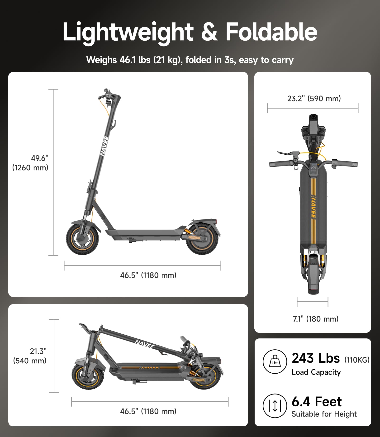 - -Foldable & Lightweight: Fast folds in 3 seconds, weighs just 46 lbs, and fits seamlessly into subways, buses, or car trunks. Whether you’re commuting to work, hopping on public transit, or heading out for a weekend adventure, it’s your ultimate companion for effortless urban mobility.