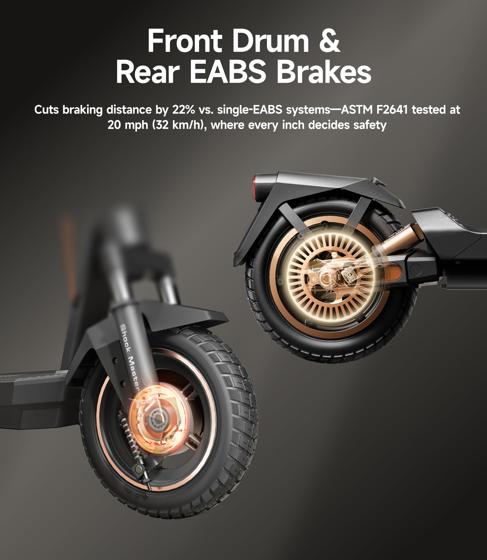 - -Advanced Triple Braking Systems: With a front drum brake, rear disc brake, and EBAS, this e-scooter ensures precise, reliable stopping power—whether you’re navigating busy city streets, descending steep hills, or cruising through offroad trails. Every stop is as smooth as your ride, giving you confidence in every terrain.