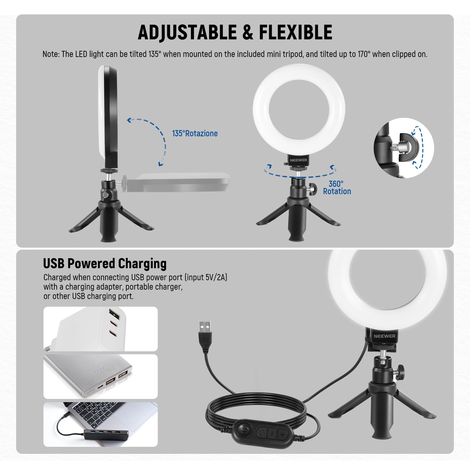 - 【USB Powered Charging】 The 10W LED ring light operates at 5V/2A, with a built in 6ft/1.8m charging cable, and can be powered via gears with USB ports such as displays, laptops, mobile power supplies equipment, or phone chargers, providing energy efficient and environmentally friendly photography or daily lighting solutions. Note: Mount the clip with a hole on the camera side to avoid obstructing the lens