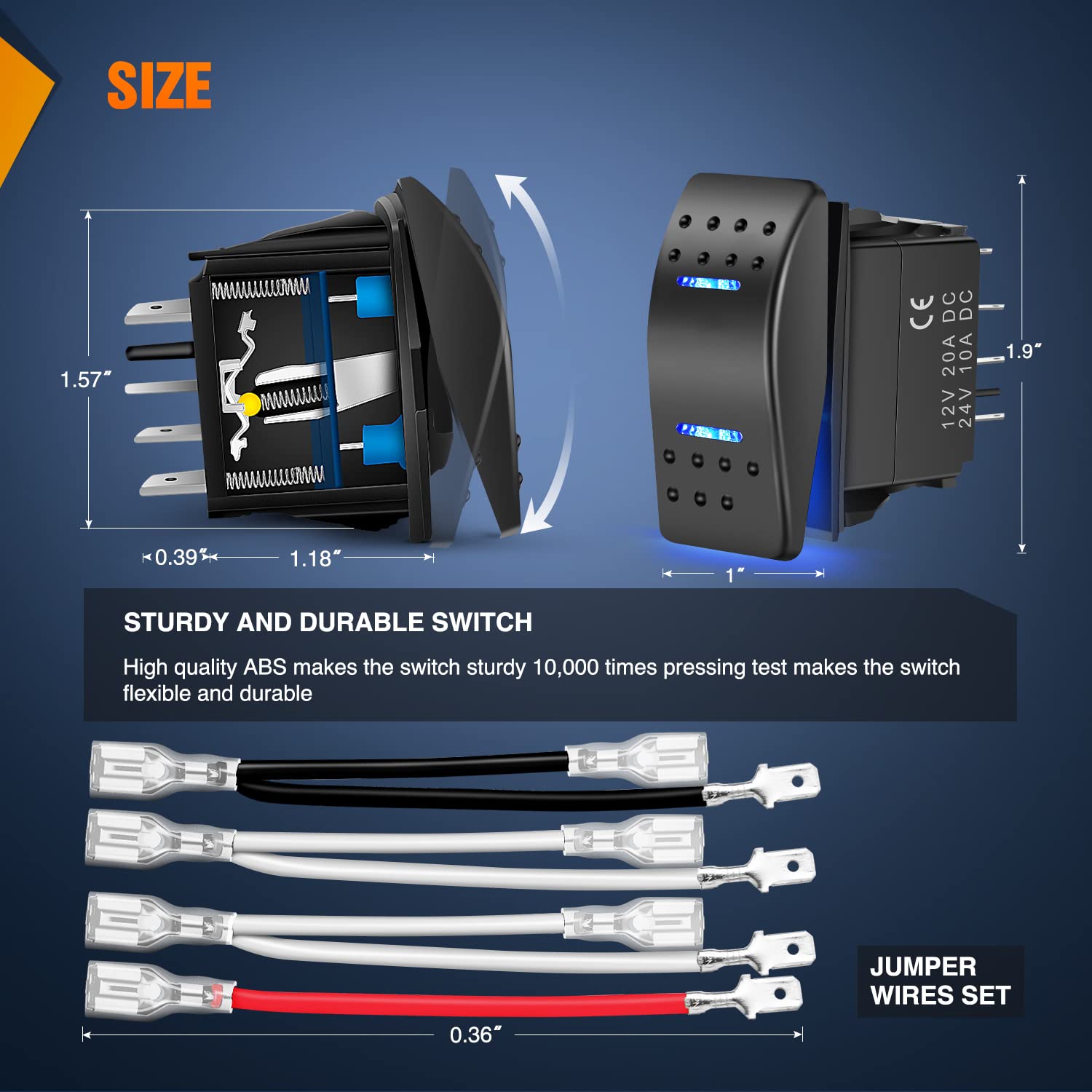 - Easy to install and use: 7 pin on off on rocker switch with DPDT design (double pole double Throw), rated at 20AMP/12VDC and 10AMP/24VDC. Can be installed or replaced on the original rocker switch panels. It is easy and simple to set up. Can control 2 loads.