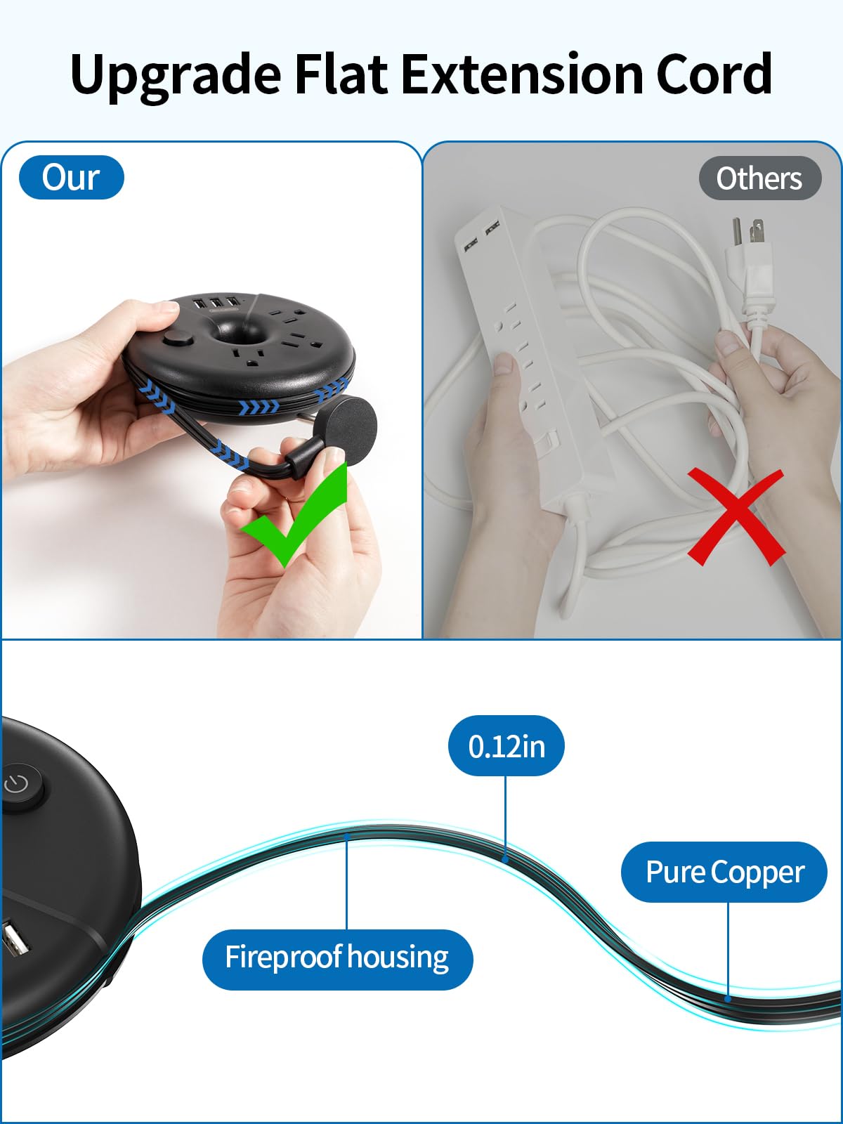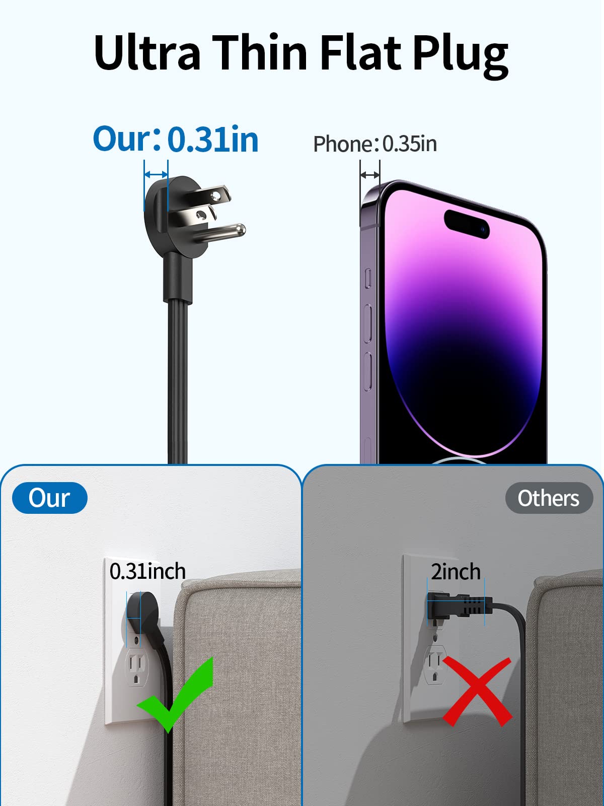 - 【Ultra Thin Flat Plug & Ultra Thin Flat Extension Cord 】1.With only a 0.31-inch ultra flat plug design, the upgraded flat wall plug is thinner than the regular flat plugs, which can easily fit in tight spots and hide behind the furniture. 2.This flat extension cord is much thinner than standard round cable, allowing it to run smoothly under carpets and through door gaps.